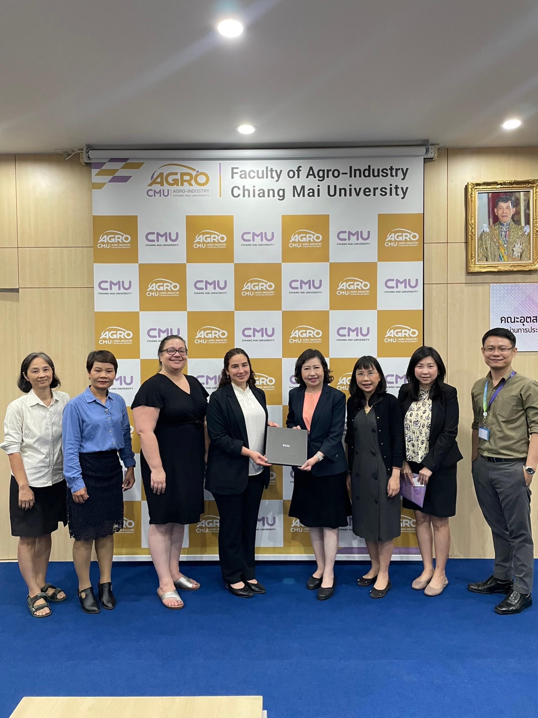 On November 7th, 2023, Assistant Professor Sujinda Sriwattana Ph.D., Dean of Faculty of Agro-Industry with Associate Professor Pichaya Poonlarp, Associate Dean and Assistant Professor Sorraya Khiewnavawongsa, Assistant dean, also Professors from Division of Food Science and Technology welcomed Dr. Sarah Cardey and Ms. Lamma Zghoul from University of Reading, United Kingdom. This occasion is for discussing research collaboration, student mobility and possibility of establishing a Double Degree Program for Master Degree Student at Meeting Room 3, Faculty of Agro-Industry.