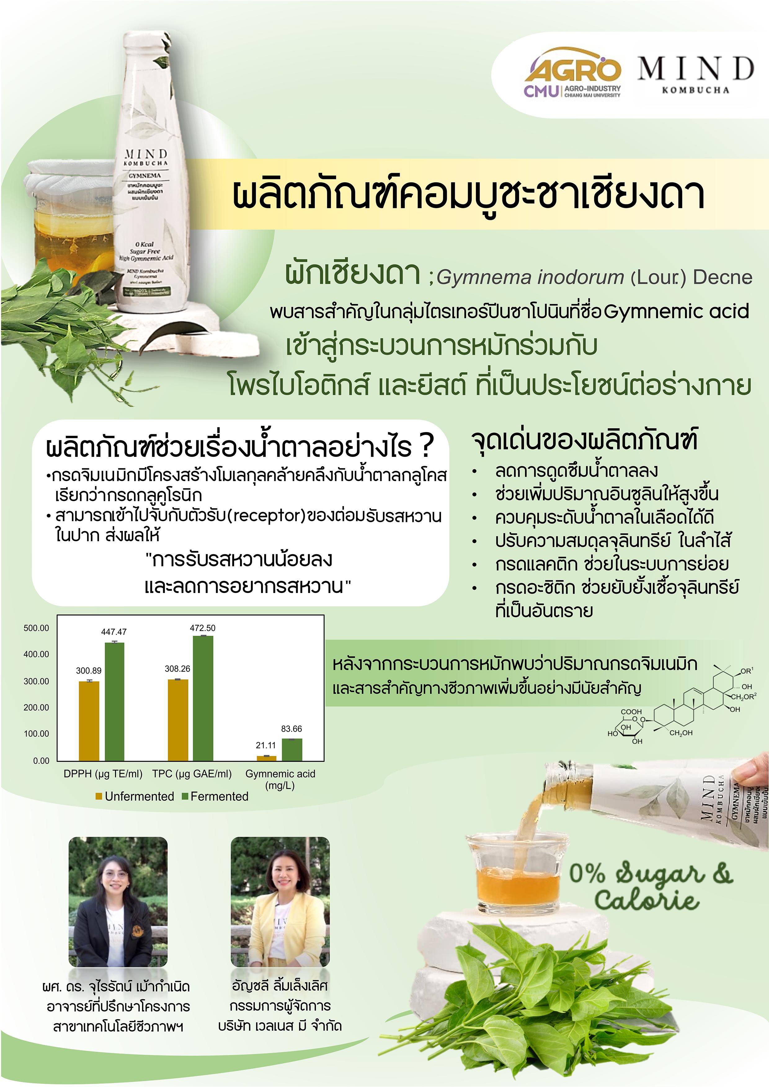 ผลิตภัณฑ์คอมบูชะชาเชียงดา เป็นงานวิจัยของคณะอุตสาหกรรมเกษตรร่วมกับบริษัท เวลเนส มี จำกัด ภายใต้แบรนด์ Mind kombucha ในชื่อผลิตภัณฑ์ มายด์ คอมบูชา จิมนีมา โดยมี ผู้ช่วยศาสตราจารย์ ดร.จุไรรัตน์ เม้ากำเนิด เป็นหัวหน้าโครงการ