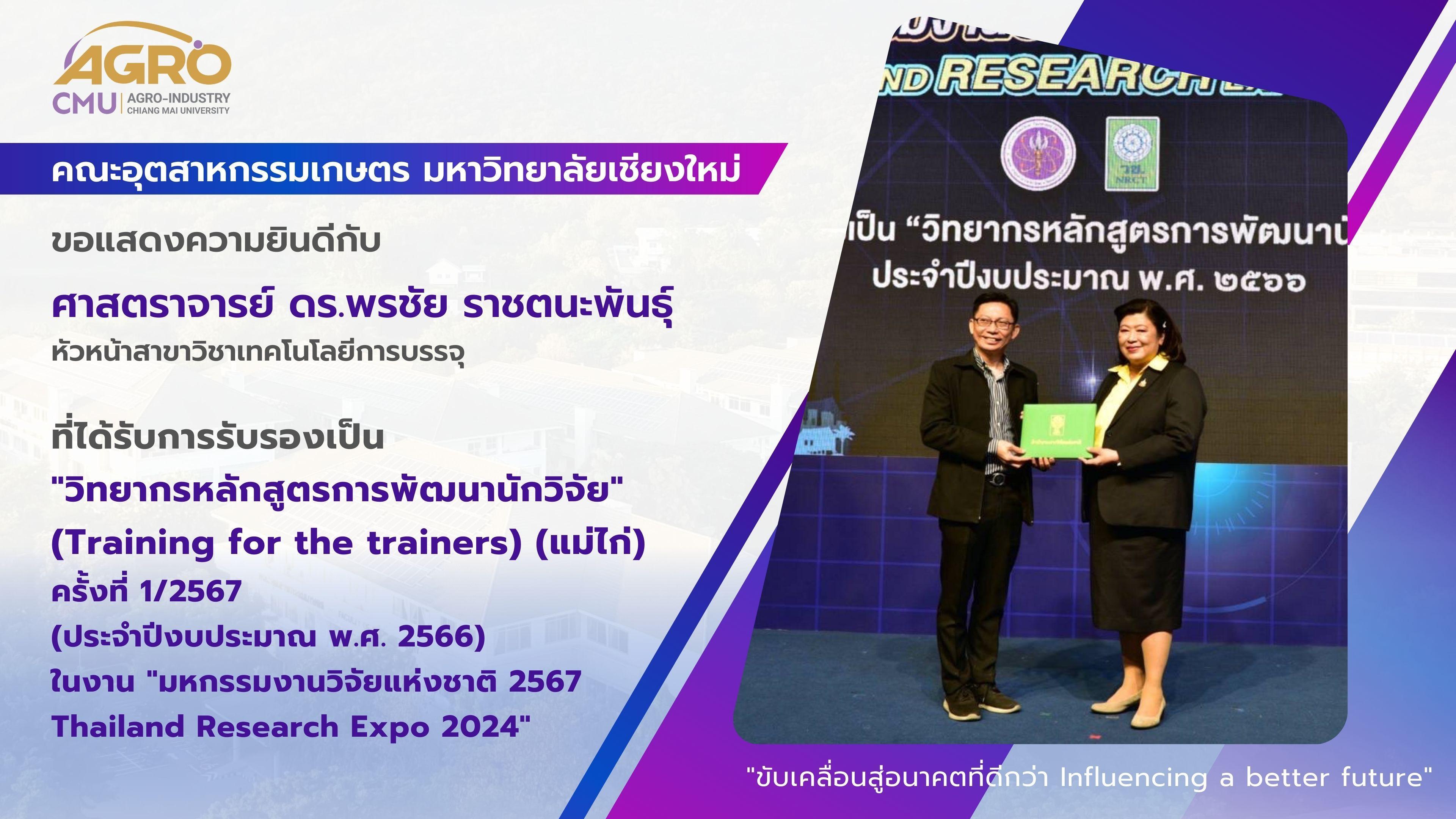พุธที่ 28 สิงหาคม 2567 ศาสตราจารย์ ดร.พรชัย ราชตนะพันธุ์ หัวหน้าสาขาวิชาเทคโนโลยีการบรรจุ เข้ารับเกียรติบัตรรับรองการเป็น "วิทยากรหลักสูตรการพัฒนานักวิจัย" (Training for the trainers) (แม่ไก่) ครั้งที่ 1/2567 (ประจำปีงบประมาณ พ.ศ. 2566) ในงาน "มหกรรมงานวิจัยแห่งชาติ 2567 Thailand Research Expo 2024" ณ เวที Highlight Stage ห้องนิทรรศการ ชั้น 22 โรงแรมเซ็นทาราแกรนด์ และบางกอกคอนเวนชันเซ็นเตอร์ เซ็นทรัลเวิร์ล กรุงเทพฯ โดยมีวัตุประสงค์เพื่อสร้างวิทยากรฝึกอบรมหลักสูตรการพัฒนาวิจัย เพื่อให้สามารถเป็นวิทยากรหลักสูตรการพัฒนานักวิจัย ที่สามารถนำหลักสูตรไปจัดการฝึกอบรมเพื่อสร้างนักวิจัยรุ่นใหม่ ให้มีจำนวนเพิ่มมากขึ้นทั้งเชิงปริมาณและคุณภาพ สามารถนำผลงานทางวิชาการไปใช้ประโยชน์ในพื้นที่ได้