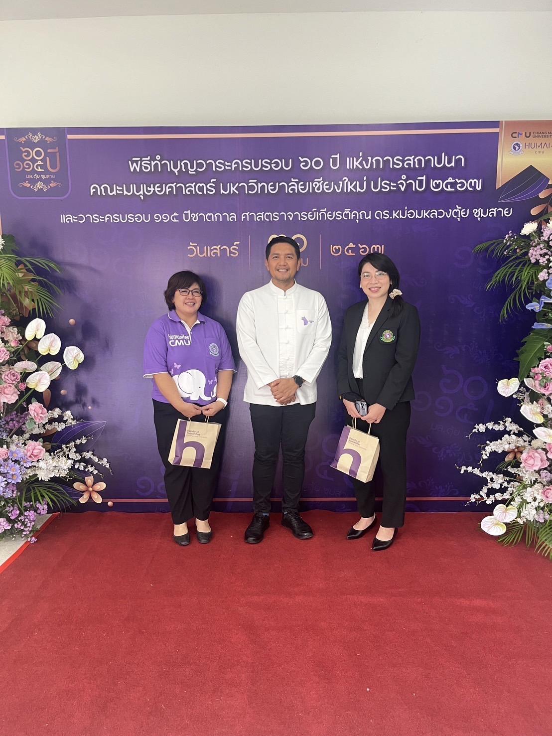 เมื่อวันที่ 31 สิงหาคม 2567 ผู้ช่วยศาสตราจารย์ ดร.จุไรรัตน์ เม้ากำเนิด ผู้ช่วยคณบดี เป็นผู้แทนคณบดีเข้าร่วมพิธีทำบุญวันคล้ายวันสถาปนาคณะมนุษยศาสตร์ ในโอกาสเฉลิมฉลองครบรอบ 60 ปีแห่งการสถาปนาคณะฯ และพิธีทำบุญครบรอบ 115 ปี ชาตกาล พร้อมกันนี้ได้ร่วมทำบุญเพื่อสมทบกองทุนพัฒนาคณะฯ ณ ห้องประชุมศาสตราจารย์ ดร.มล.ตุ้ย ชุมสาย ชั้น 8 อาคาร HB 7 คณะมนุษยศาสตร์ มหาวิทยาลัยเชียงใหม่