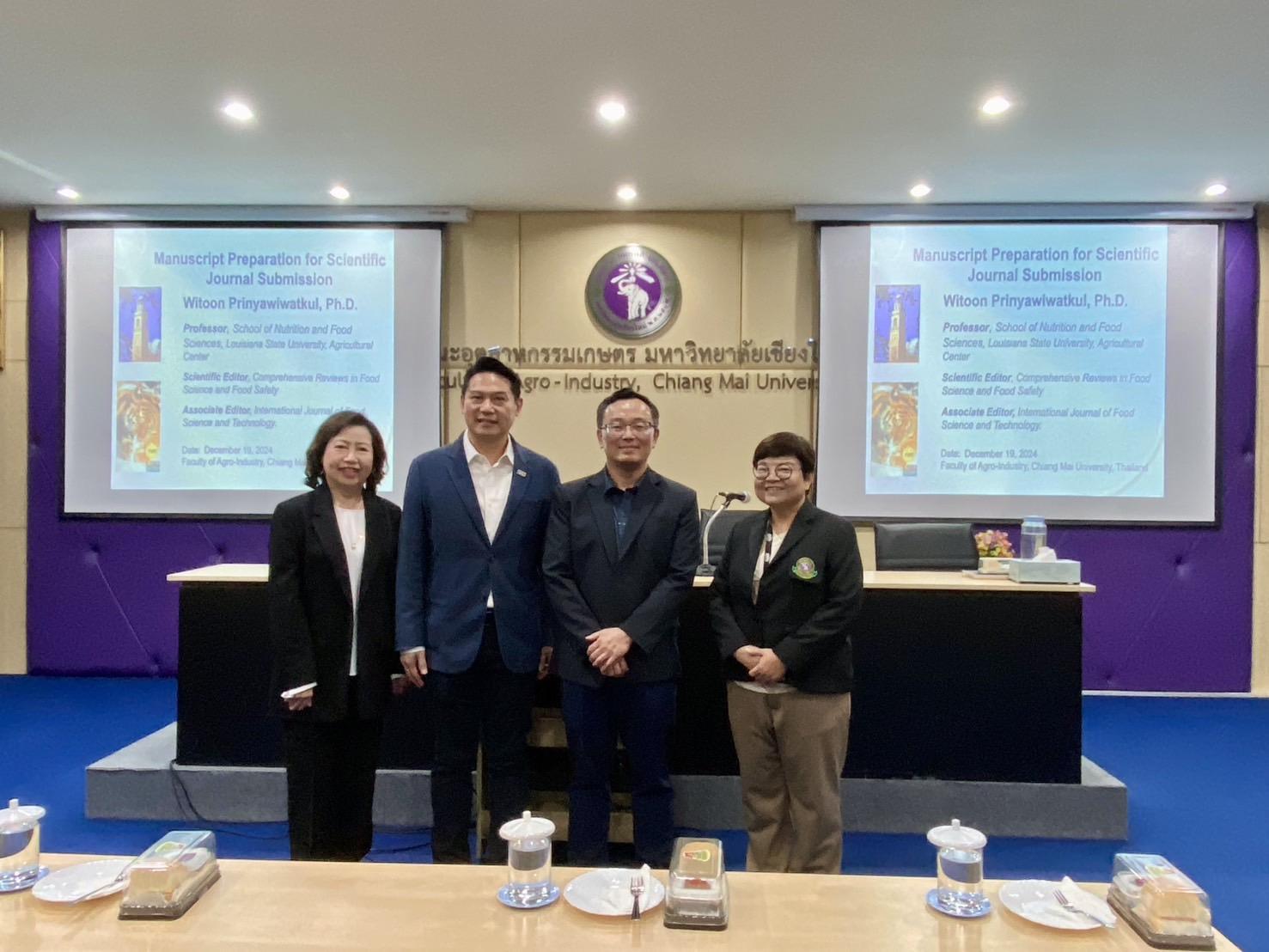 On December 19–20, 2024, Associate Professor Dr. Yuthana Phimolsiripol, Dean of the Faculty of Agro-Industry, and Associate Professor Dr. Niramon Utama-Ang, Associate Dean, welcomed Professor Dr. Witoon Prinyawiwatkul from the School of Nutrition and Food Science, Louisiana State University, USA Editorial Boards of prominent US-Based and UK-based journals, participated as a guest speaker and advisor for the event.