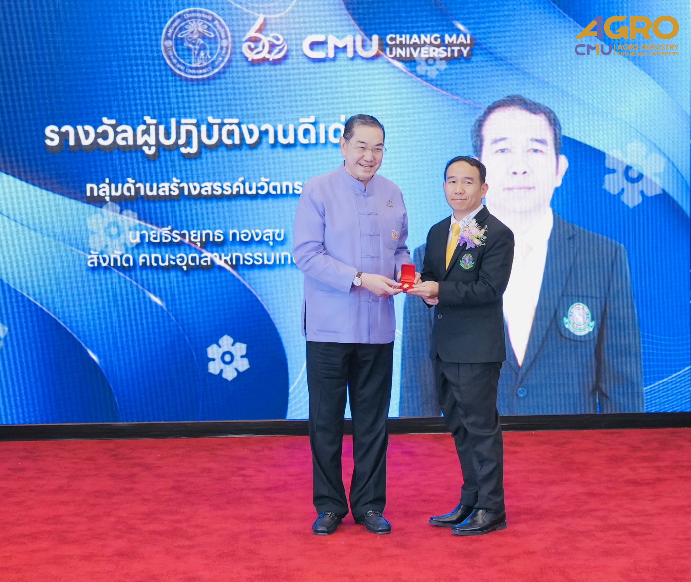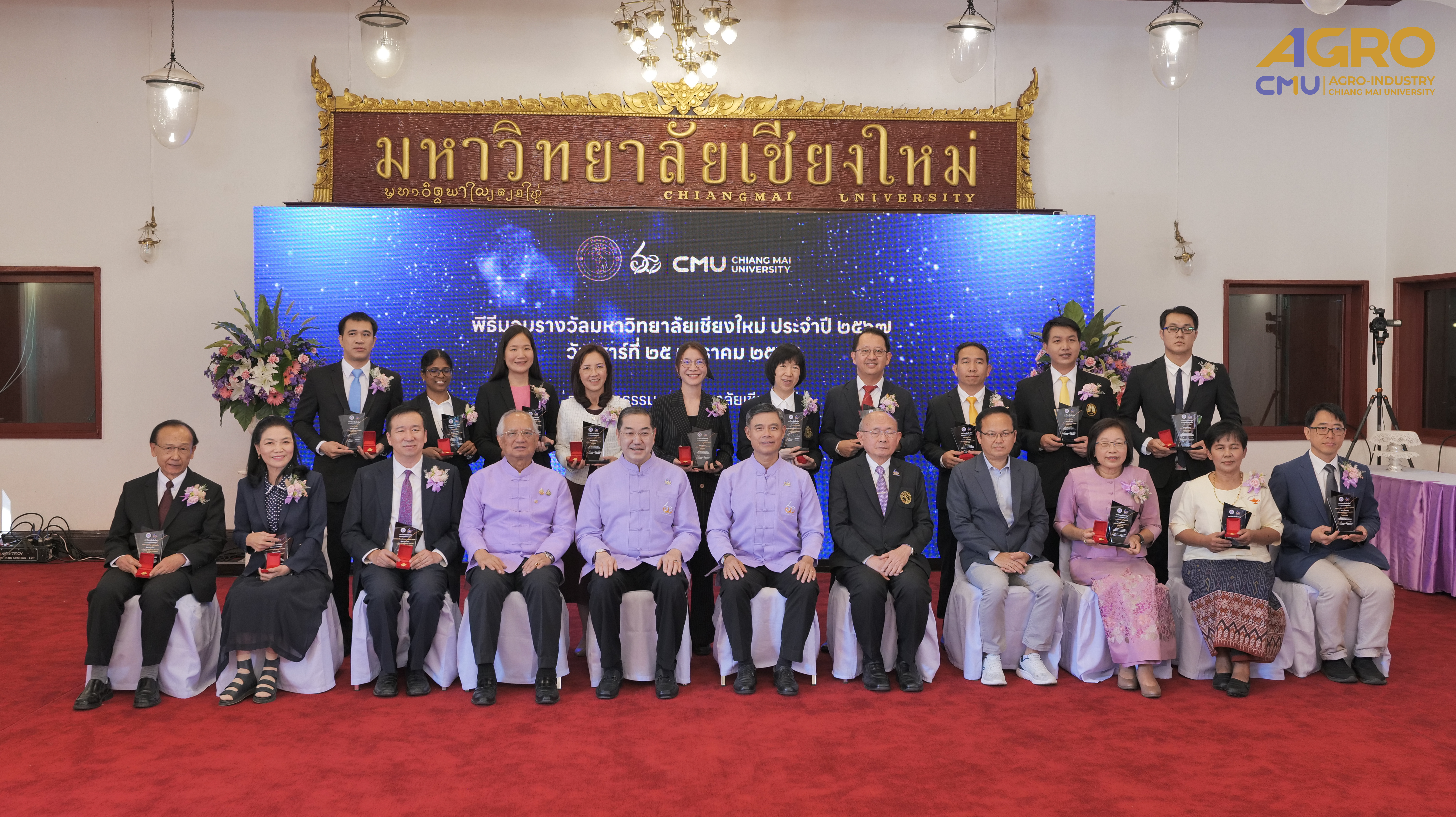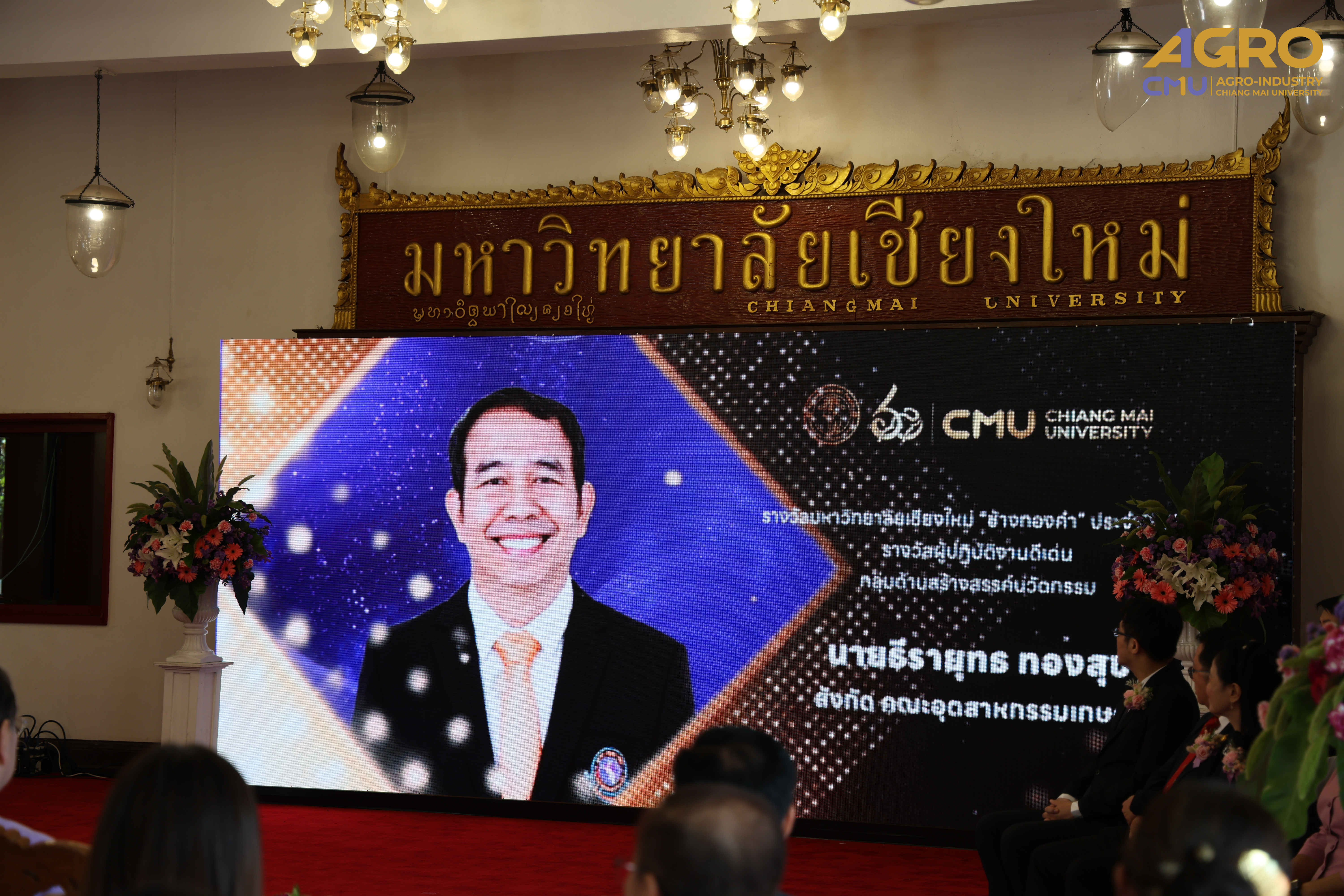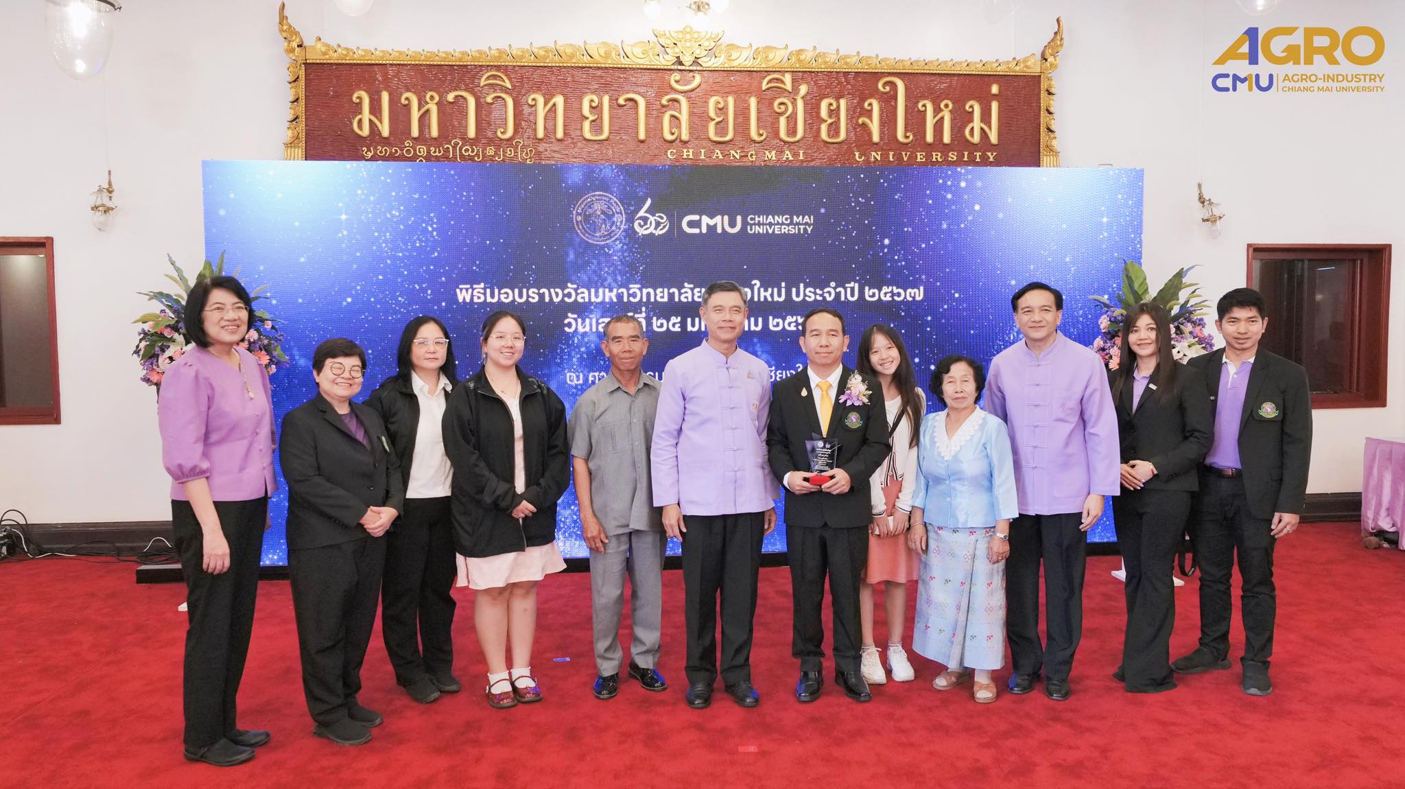 On January 25, 2025, Associate Professor Dr.Sutee Wangtueai, Vice Dean and representative of the Dean, along with the executives, faculty members, and staff of the Faculty of Agro-Industry, Chiang Mai University participated in the award ceremony to congratulate to Mr.Theerayuth Thongsuk on receiving the Chiang Mai University "Golden Elephant" award for the year 2024 in the occasion of the Anniversary of the Chiang Mai University Founding Day.