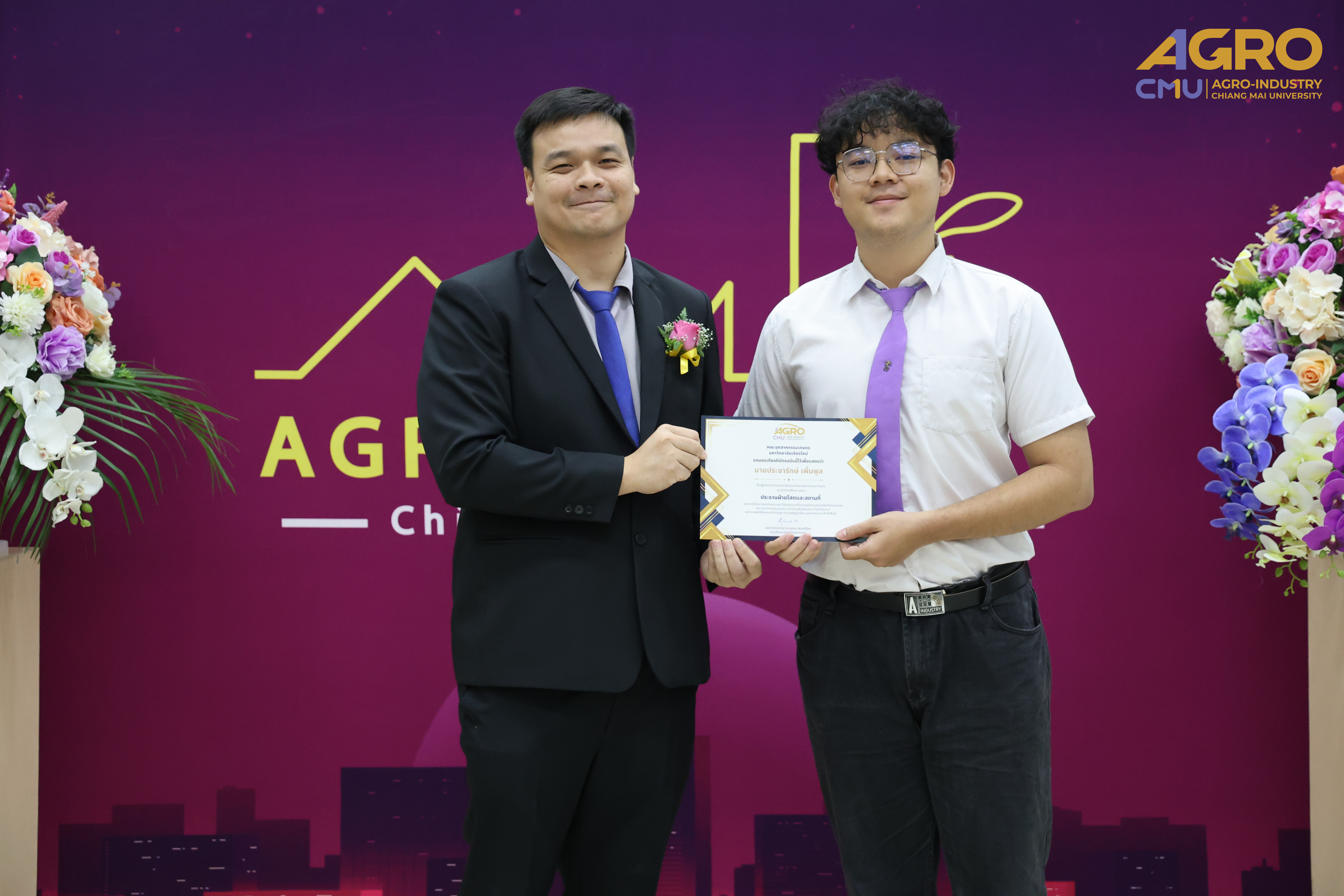 The Faculty of Agro-Industry recognizes the importance of students who contribute to the faculty and aims to encourage and support them in various aspects, including academics, faculty and community service, and well-rounded abilities. As part of this initiative, a certificate of recognition was awarded to students who have brought prestige to the faculty and dedicated themselves to its betterment. This recognition was presented alongside the scholarship awards, which were categorized into four types: Financial Need-Based, Academic Excellence, Agro DNA, and Faculty & Community Service.