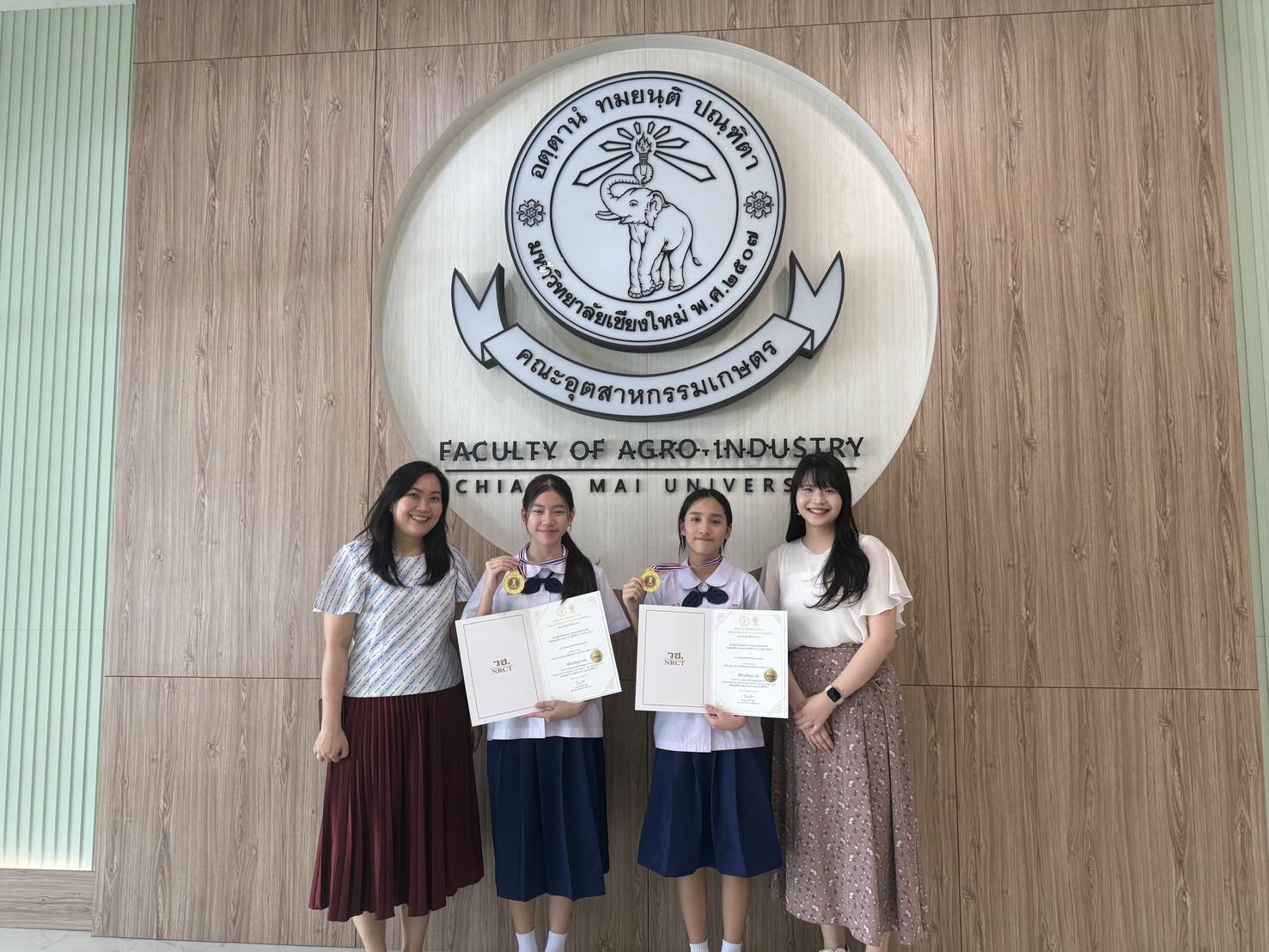 The Faculty of Agro-Industry, Chiang Mai University, extends its congratulations to Miss Darin Unchakorn, Miss Premin Aseang, and Miss Mingxi Zhang, Grade 8 students, along with their advisor, Mrs. Warunee Na Lampang, from Montfort College. They presented their project titled "Scoby Wounds Digital: Wound Dressing from Scoby and Moringa Leaf Extract" and won a gold medal in the Thailand I New Generator Awards 2025 (I-New Gen Award 2025) in the high school category for Energy, Materials, and Biochemistry. This achievement was showcased on the Pitching Stage at the "Inventor's Day" event held from February 2-6, 2025, at Event Hall 100-102, BITEC, Bangna, Bangkok. The event was organized by the National Research Council of Thailand (NRCT), Research and Innovation Promotion Division, in collaboration with educational institutions under an MOU. Dr. Niphawan Panti from the Faculty of Agro-Industry, Chiang Mai University, served as a co-advisor.
