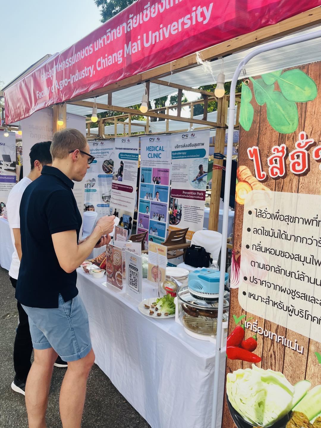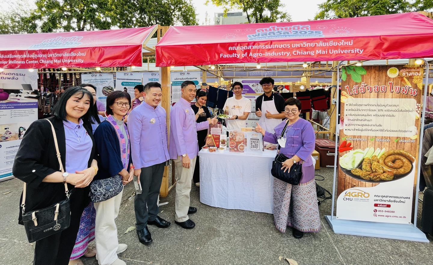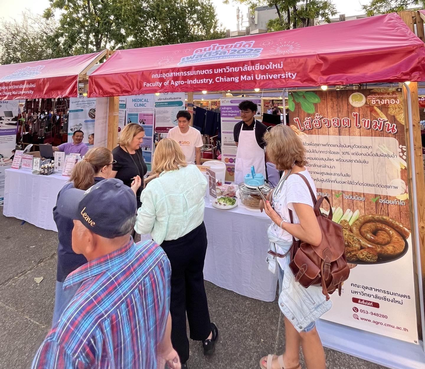 วันที่ 16 กุมภาพันธ์ 2568 คณะอุตสาหกรรมเกษตร นำโดยรองศาสตราจารย์ ดร. นิรมล อุตมอ่าง รองคณบดี ร่วมนำหลักสูตร 8 สาขาวิชา และหลักสูตรประกาศนียบัตร (non degree) ออกจัดแสดงในงาน คนไทยมีดี festival 2025 ณ ลานประตูท่าแพ และยังนำผลิตภัณฑ์ไส้อั่วลดไขมัน ออกขายภายในงานอีกด้วย