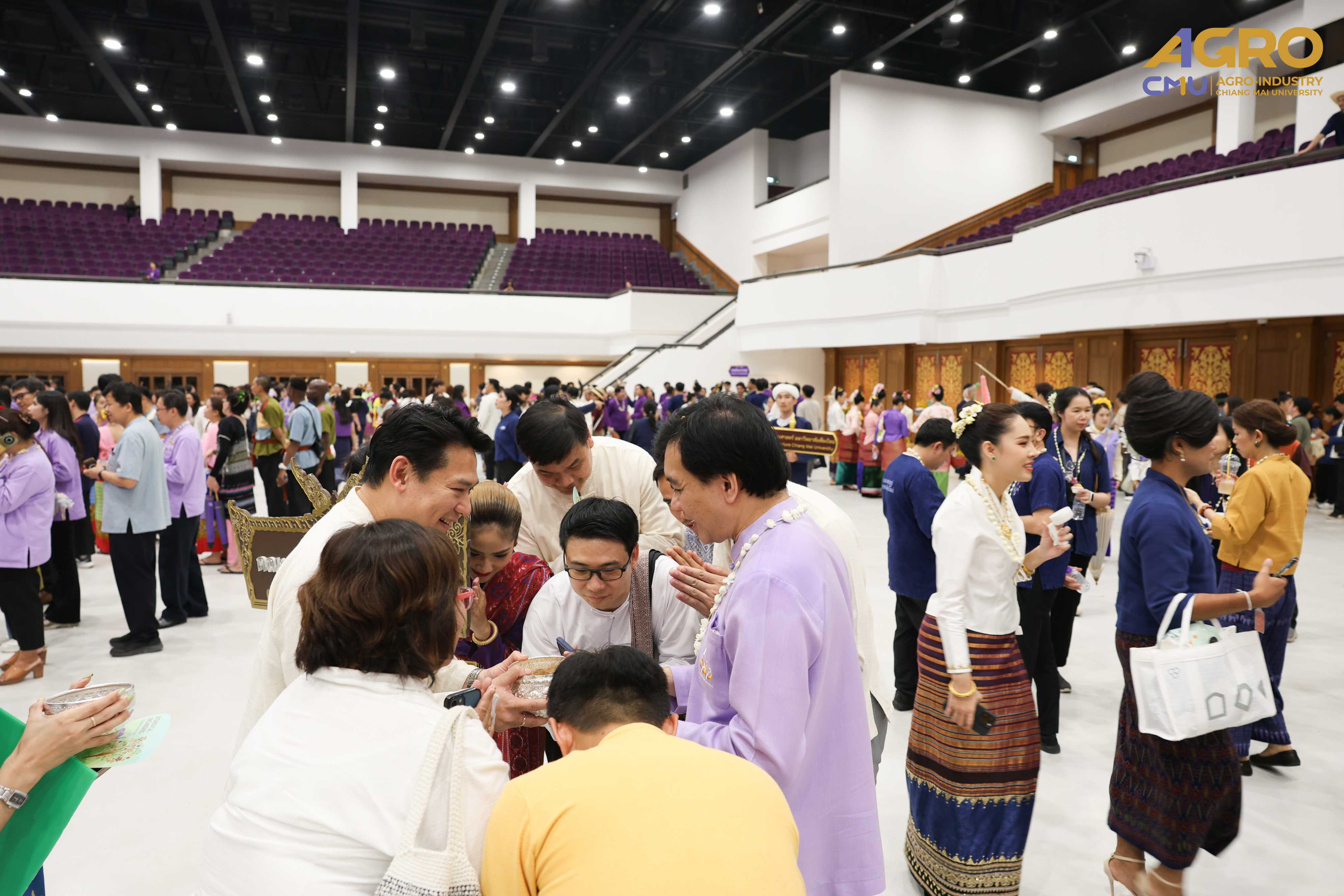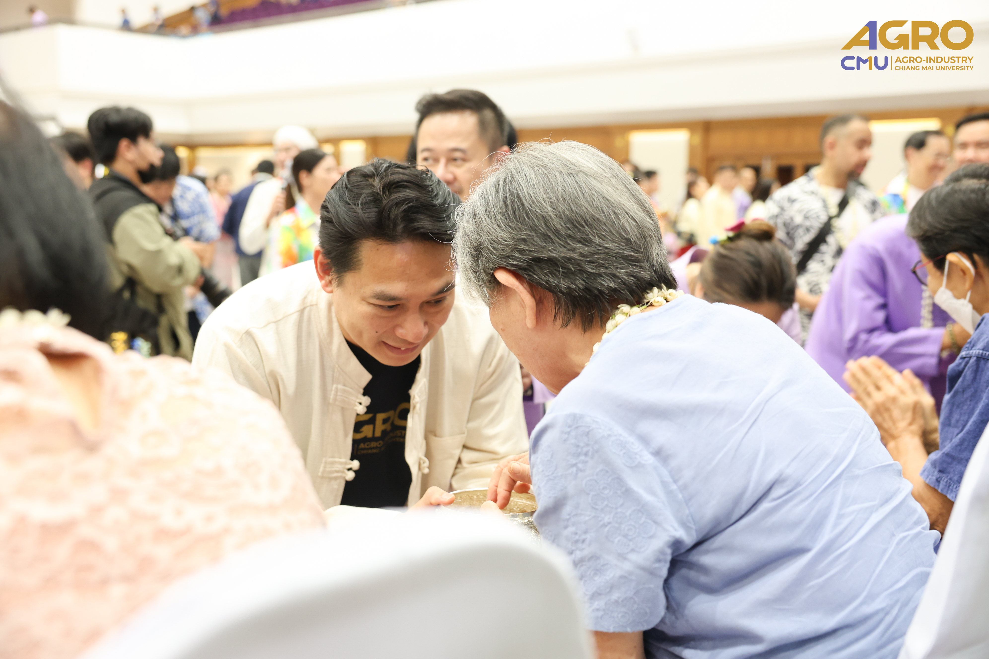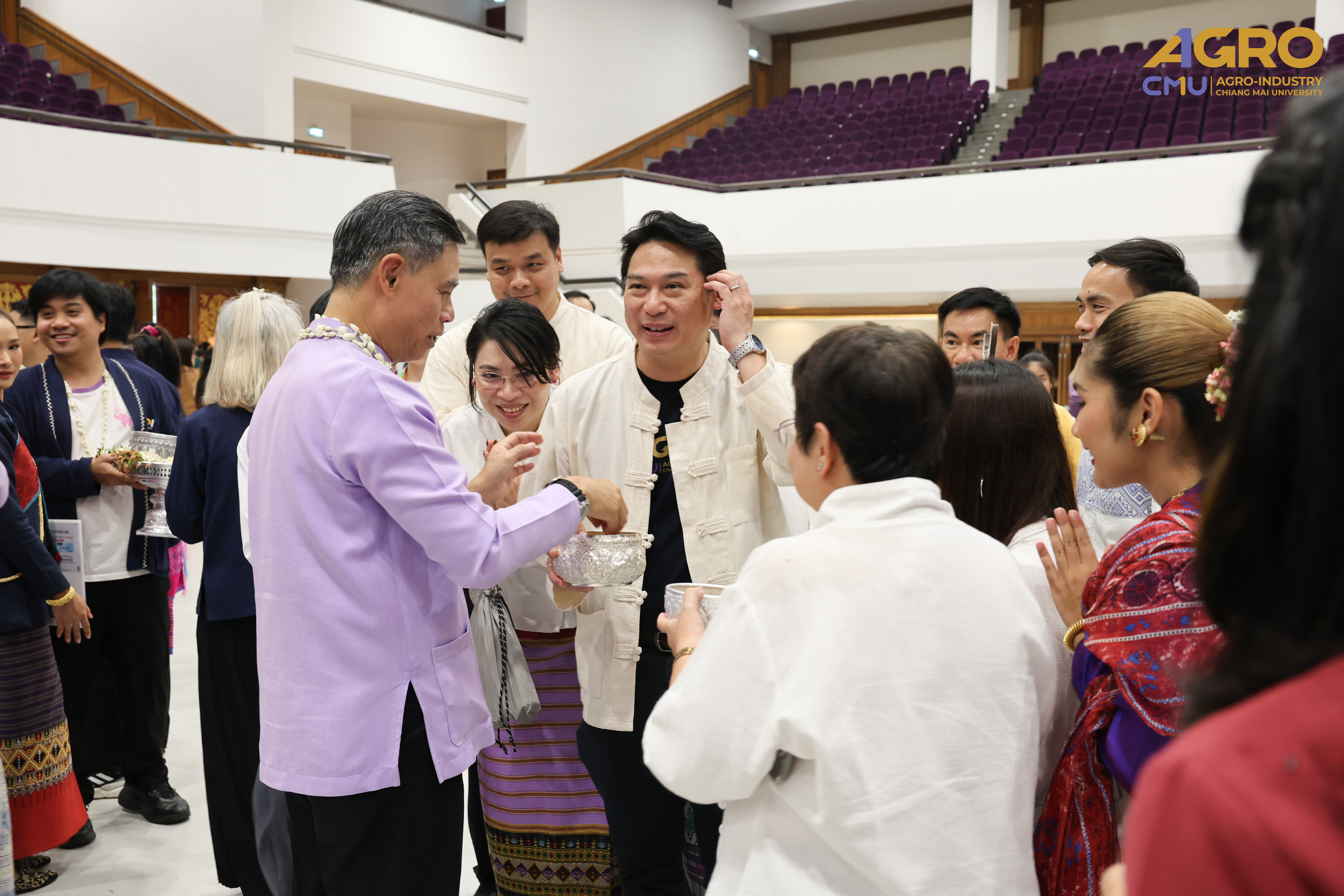 On April 25, 2025, Associate Professor Dr.Yuthana Phimolsiripol, Dean of the Faculty of Agro-Industry, along with the executives, faculty members, participated in “Rod Nam Dum Hua : the Water Pouring Ceremony of the University's President and Elders for the year 2025” , to pay respects to the senior members of the university and ask for blessings from the University's President and Elders for good fortune on the occasion of Songkran Festival which was held at CMU Convention Center, Chiang Mai University. The water blessing ceremony is a significant event in the university's continuous efforts to uphold and preserve Thai traditions, showing respect to elders, and fostering a sense of unity and gratitude within the community.