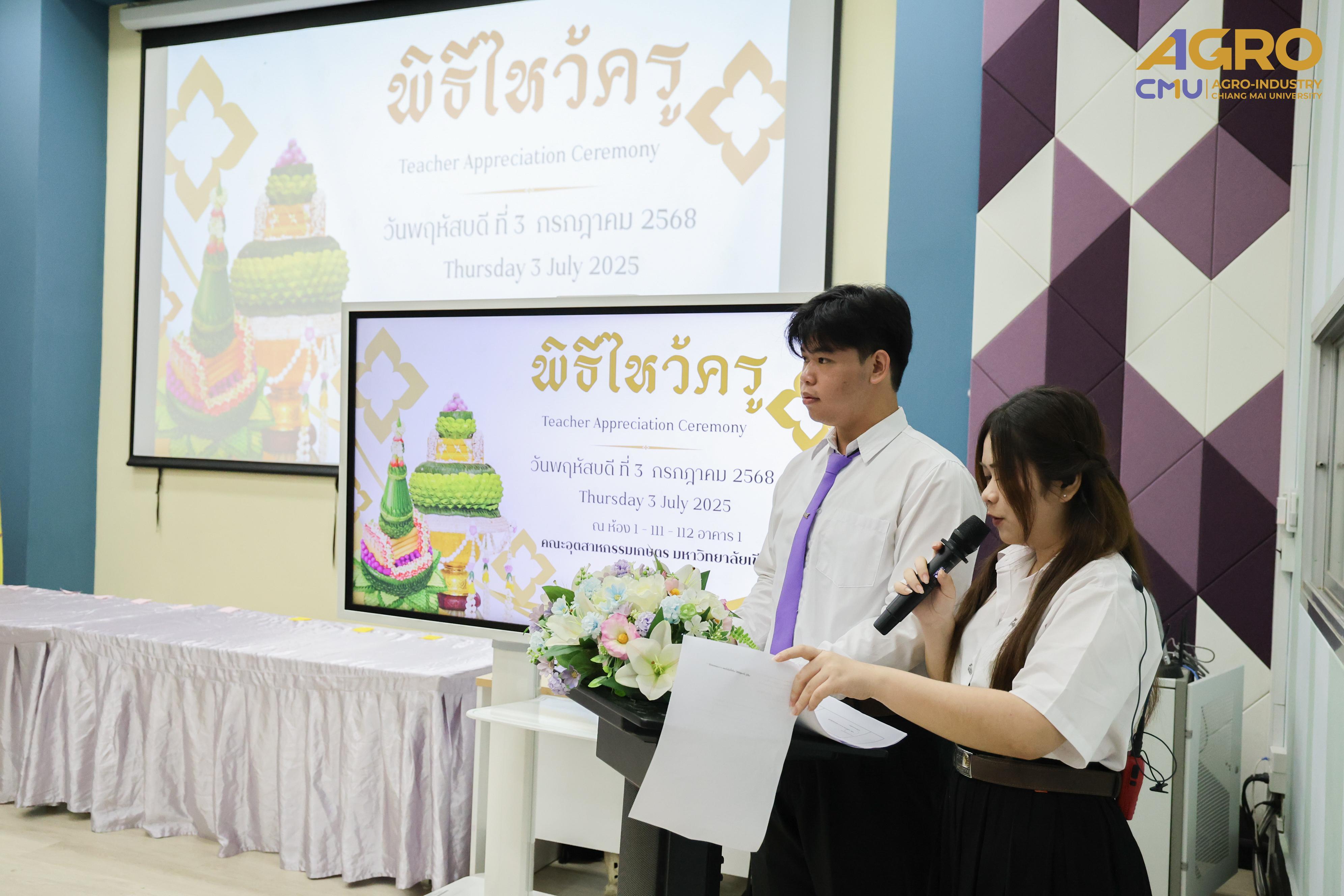 เมื่อวันที่ 3 กรกฎาคม 2568 ที่ผ่านมา สโมสรนักศึกษาคณะอุตสาหกรรมเกษตร มหาวิทยาลัยเชียงใหม่ ได้จัดพิธีไหว้ครูประจำปีการศึกษา 2568 ขึ้น ณ ห้อง 1-111-112 อาคาร 1 คณะอุตสาหกรรมเกษตร โดยได้รับเกียรติจากท่านคณบดี รองศาสตราจารย์ ดร. ยุทธนา พิมลศิริผล เป็นประธานในพิธี และมีนักศึกษา คณาจารย์ และเจ้าหน้าที่เข้าร่วมงานกว่า 100 คน พิธีไหว้ครูในครั้งนี้จัดขึ้นเพื่อเป็นการสืบสานประเพณีอันดีงามของไทย และเป็นการแสดงความเคารพ ความกตัญญูกตเวทิตาของนักศึกษาที่มีต่อคณาจารย์ผู้ให้ความรู้ ในบรรยากาศที่เต็มไปด้วยความเลื่อมใสศรัทธา นักศึกษาได้ร่วมกันถวายพานไหว้ครูและขอพรจากคณาจารย์ เพื่อให้การศึกษาเล่าเรียนเป็นไปด้วยความเรียบร้อย คณะอุตสาหกรรมเกษตรให้ความสำคัญกับการสืบสานวัฒนธรรมและประเพณีไทย โดยเฉพาะพิธีไหว้ครูซึ่งเป็นการปลูกฝังค่านิยมที่ดีงามให้กับนักศึกษา เพื่อให้เกิดความเคารพในครูอาจารย์และมีจิตสำนึกในการศึกษาที่ดี การจัดพิธีไหว้ครูในปีนี้สะท้อนถึงความสำคัญของการรักษาขนบธรรมเนียมประเพณีไทย พร้อมทั้งสร้างความสัมพันธ์อันดีระหว่างนักศึกษาและคณาจารย์ เพื่อเป็นรากฐานที่ดีในการศึกษาและการเรียนรู้ต่อไป