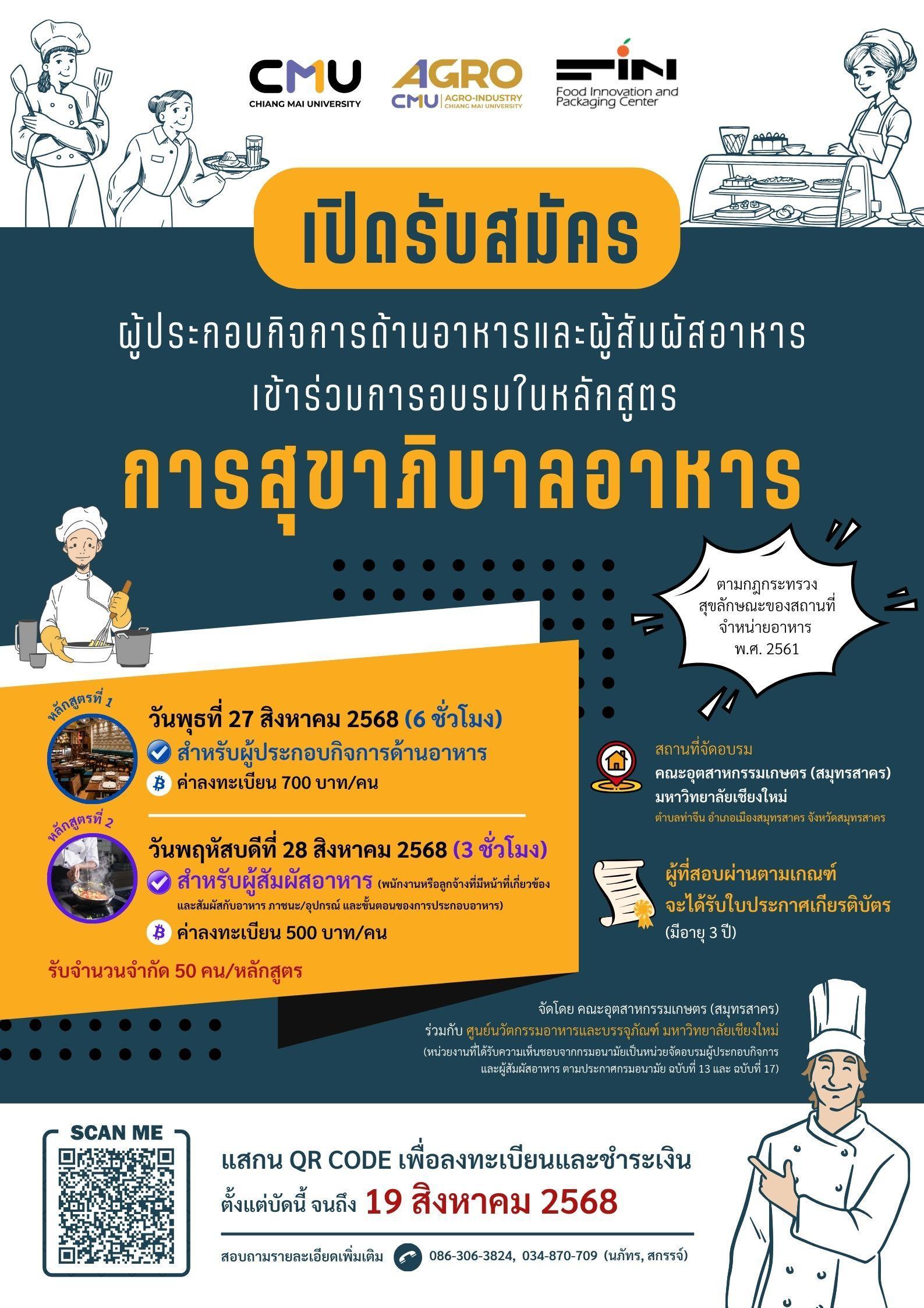 หลักสูตรที่ 1 สำหรับผู้ประกอบกิจการด้านอาหาร วันพุธที่ 27 สิงหาคม 2568 (6 ชั่วโมง) ค่าลงทะเบียน 700 บาท/คน