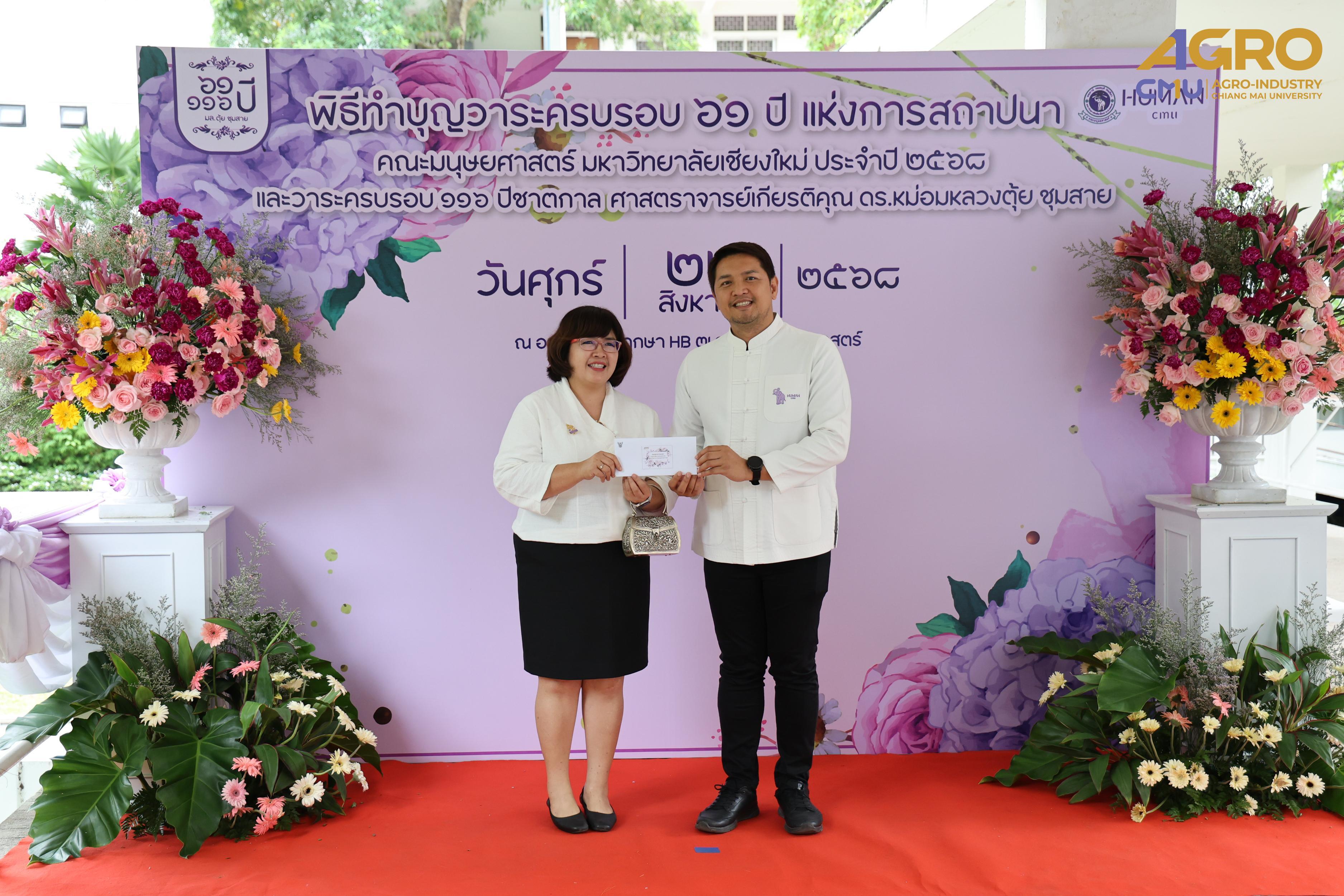 On August 22, 2025, Ms.Piyanuch Sawasdee, Faculty Secretary, joined the merit-making ceremony in celebration of the 61st Anniversary of the Faculty of Humanities, Chiang Mai University. On this occasion, the Faculty of Agro-Industry also contributed a donation to support the Faculty of Humanities Development Fund at the Faculty of Humanities, Chiang Mai University.