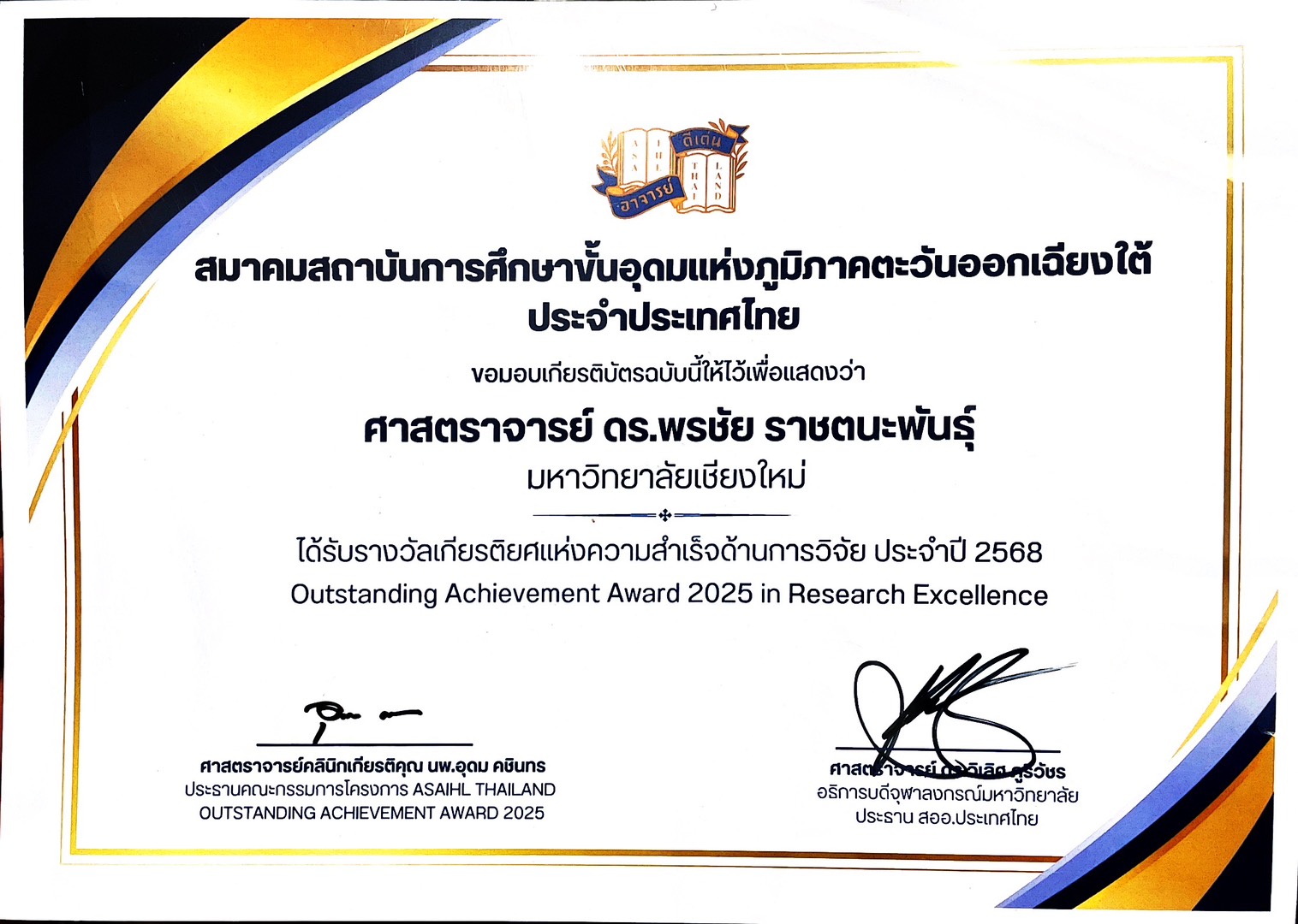 The Faculty of Agro-Industry, Chiang Mai University, extends its heartfelt congratulations to Professor Dr. Pornchai Rachtanapun on receiving the ASAIHL Thailand Outstanding Achievement Award 2025 in the Research category.