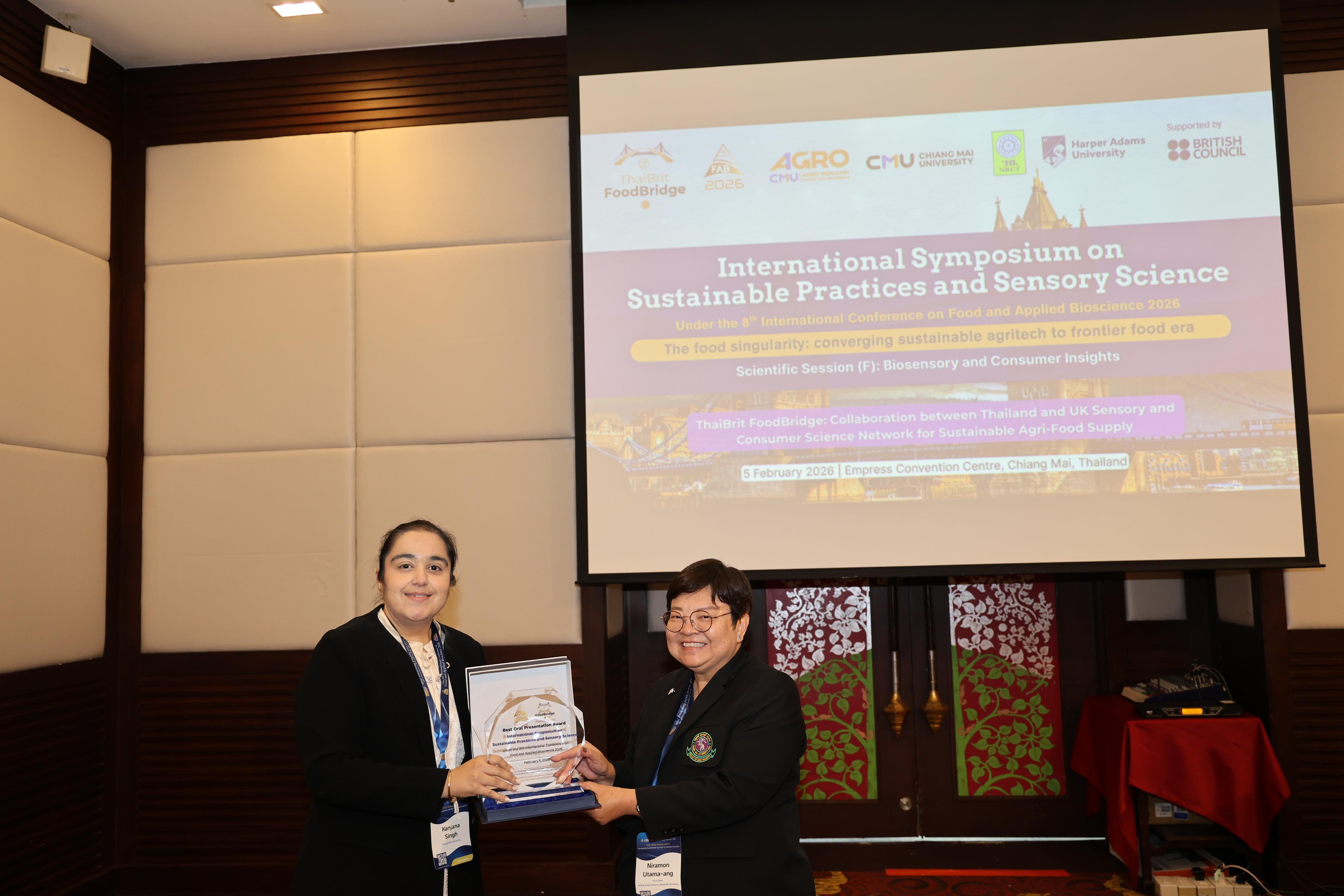เมื่อวันที่ 5 กุมภาพันธ์ 2569 คณะอุตสาหกรรมเกษตร มหาวิทยาลัยเชียงใหม่ จัดงานประชุมนานาชาติว่าด้วยแนวปฏิบัติที่ยั่งยืนและการประเมินทางประสาทสัมผัส (International Symposium on Sustainable Practices and Sensory Science) ซึ่งเป็นส่วนหนึ่งของโครงการ ThaiBrit FoodBridge: ความร่วมมือระหว่างเครือข่ายประเทศไทยและสหราชอาณาจักรด้านวิทยาศาสตร์ทางประสาทสัมผัสและผู้บริโภค เพื่อการจัดหาเกษตรอาหารอย่างยั่งยืน ภายใต้งานประชุมนานาชาติ International Conference on Food and Applied Bioscience หรือ FAB 2026 ณ ห้องประชุมเชียงใหม่ 1 ศูนย์ประชุมนานาชาติเอ็มเพรส (Empress Convention Centre) จังหวัดเชียงใหม่ โดยมี รองศาสตราจารย์ ดร.นิรมล อุตมอ่าง รองคณบดีคณะอุตสาหกรรมเกษตร และหัวหน้าโครงการ ThaiBrit FoodBridge ให้เกียรติเป็นประธานในพิธีเปิด พร้อมมอบเกียรติบัตรและโล่รางวัลแก่นักวิจัยที่มีผลงานดีเด่น