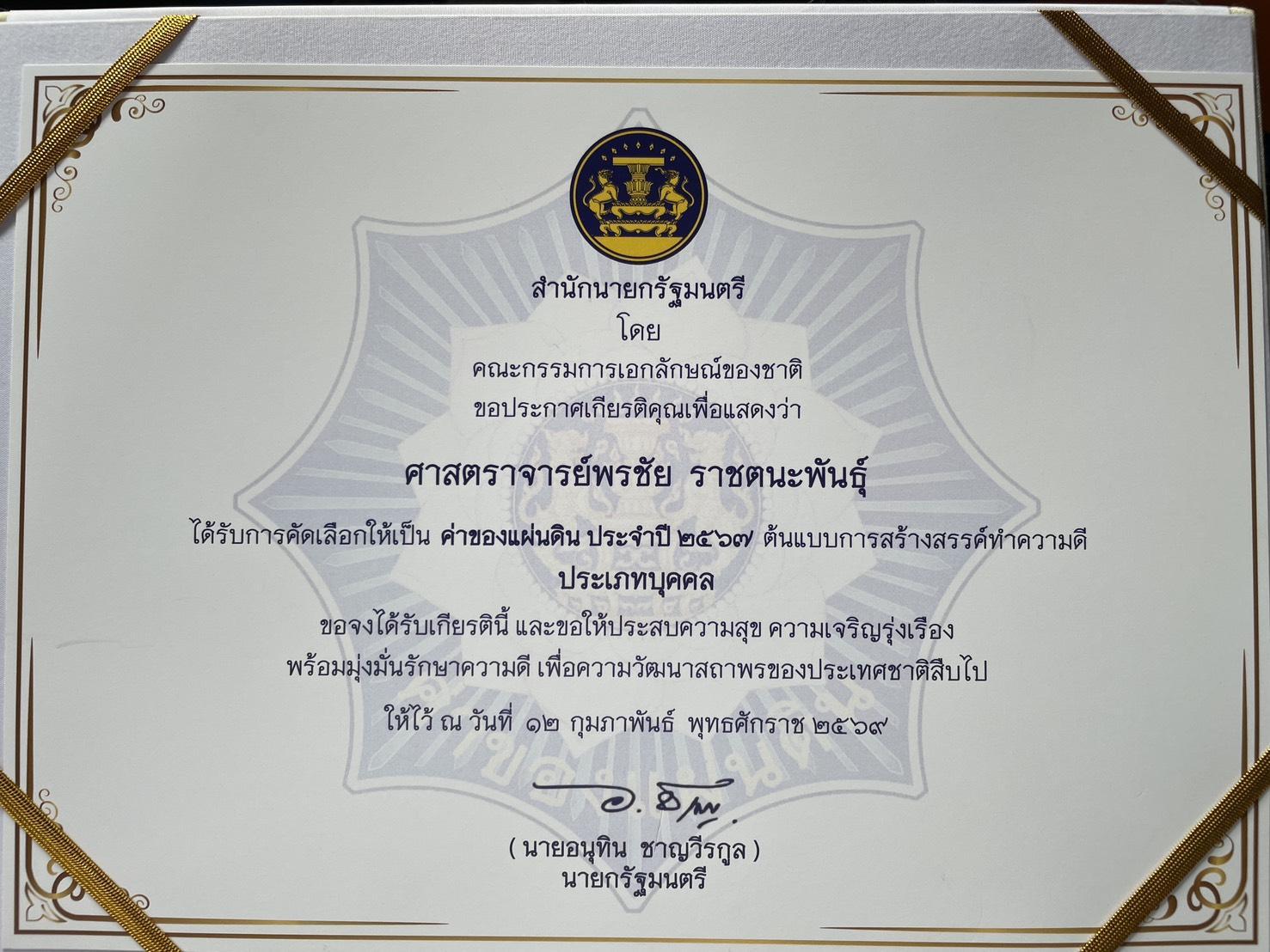 วันที่ 12 กุมภาพันธ์ 2569 ศาสตราจารย์ ดร.พรชัย ราชตนะพันธุ์ อาจารย์คณะอุตสาหกรรมเกษตร มหาวิทยาลัยเชียงใหม่ ได้เข้ารับรางวัลประกาศเกียรติคุณ ในพิธีมอบรางวัลประกาศเกียรติคุณเป็น “ค่าของแผ่นดิน” ประจำปี 2567 ประเภทบุคคล ด้านการส่งเสริมวิทยาศาสตร์และเทคโนโลยี ซึ่งมีผลงานโดดเด่นเป็นที่ประจักษ์มีคุณค่าแก่การยกย่อง และมีคุณค่าแก่การชื่นชม เพื่อยกย่องเชิดชูเกียรติ และเป็นขวัญกำลังใจที่ทำคุณประโยชน์ให้แก่ประชาชน สังคม และประเทศชาติ รวมทั้งเป็นต้นแบบแห่งการสร้างสรรค์ความดี อันพึงเป็นคุณลักษณะที่ดีแก่สังคมไทยด้วย โดยมี อนุทิน ชาญวีรกูล นายกรัฐมนตรี เป็นประธานมอบรางวัลในพิธีดังกล่าว ณ ตึกสันติไมตรี ทำเนียบรัฐบาล เขตดุสิต กรุงเทพมหานคร โดยมีผู้เสนอชื่อเข้ารับรางวัล 486 (ประเภทบุคคลหรือองค์กร) และได้รับคัดเลือก 18 (ประเภทบุคคลหรือองค์กร)