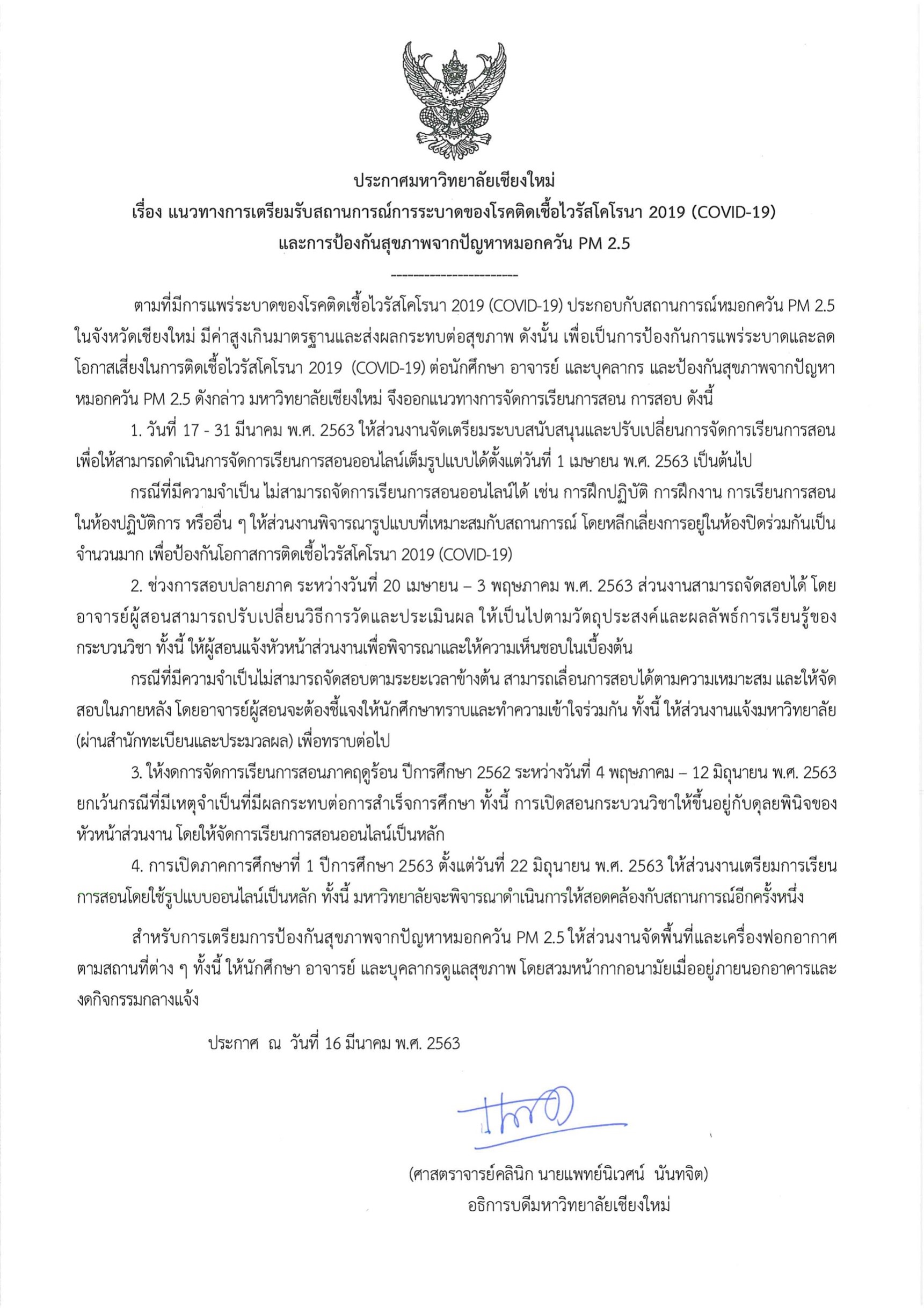 ประกาศมหาวิทยาลัยเชียงใหม่ เรื่อง การปิดทำการมหาวิทยาลัยเป็นการชั่วคราว เนื่องจากการแพร่ระบาดของโรคติดเชื้อไวรัสโคโรนา 2019 (COVID-19) ลงวันที่ 23 มีนาคม 2563 |
