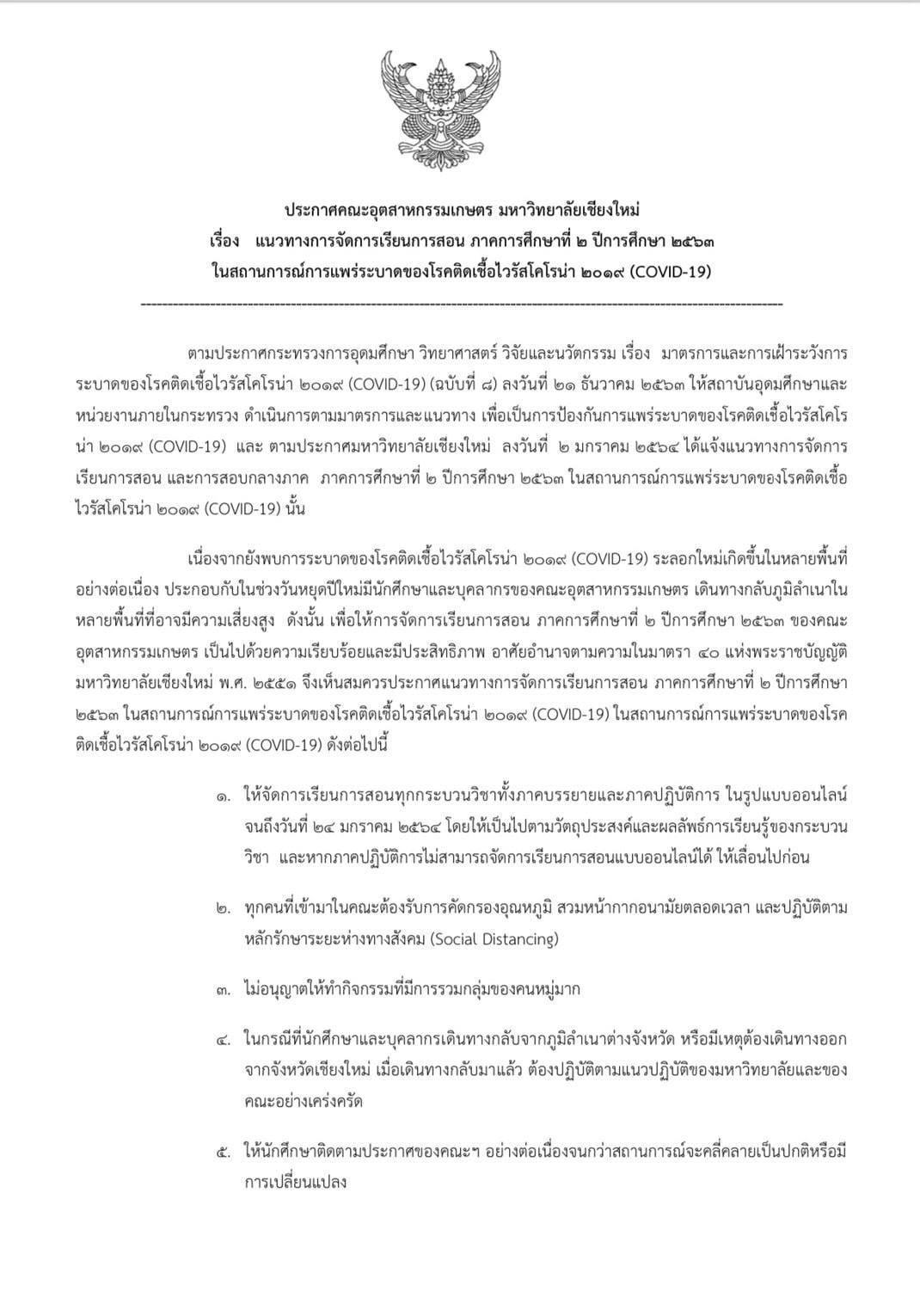 ประกาศ คณะอุตสาหกรรมเกษตร มหาวิทยาลัยเชียงใหม่ เรื่อง แนวทางการจัดการเรียนการสอนและการสอบกลางภาค ภาคการศึกษาที่ 2 ปีการศึกษา 2563 ในสถานการณ์การแพร่ระบาดของโรคติดเชื้อไวรัสโคโรนา 2019 (COVID-19) |