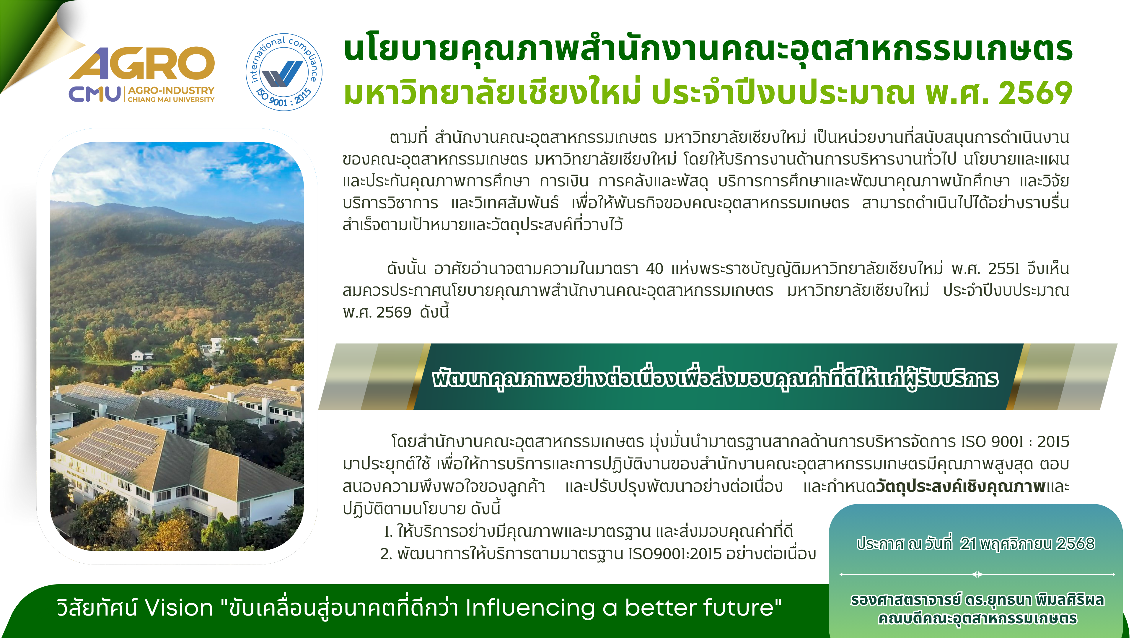 สำนักงานคณะอุตสาหกรรมเกษตร มช. รับการตรวจประเมินระบบการบริหารงาน Quality Management System สำหรับหน่วยงานสนับสนุนการศึกษา ทั้ง 5 งาน และได้รับการรับรอง มาตรฐาน ISO 9001:2015 โดยหน่วยตรวจประเมินมาตรฐานสากลที่ได้รับการรับรองระบบงาน จาก IAF-MLA Accreditation Body