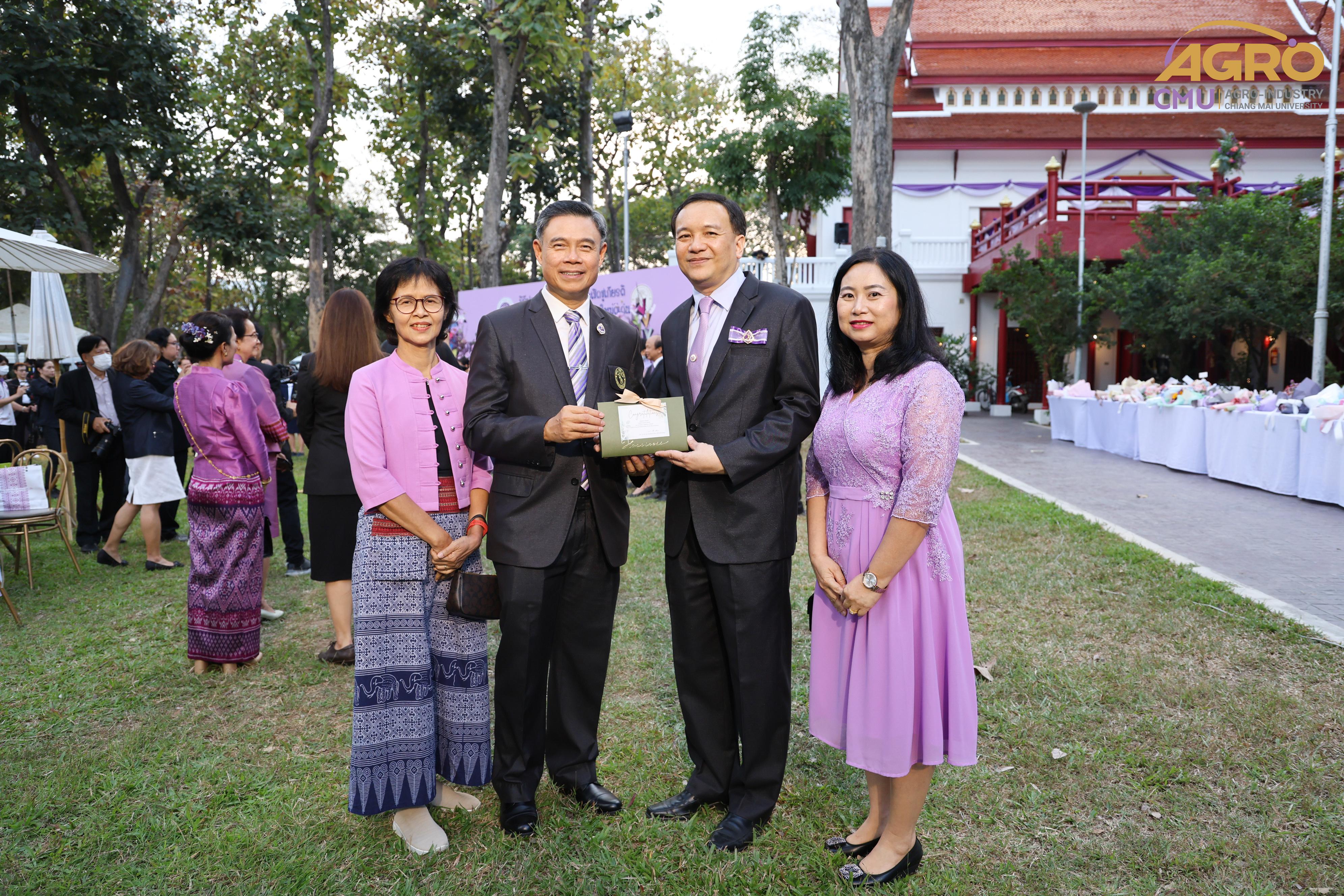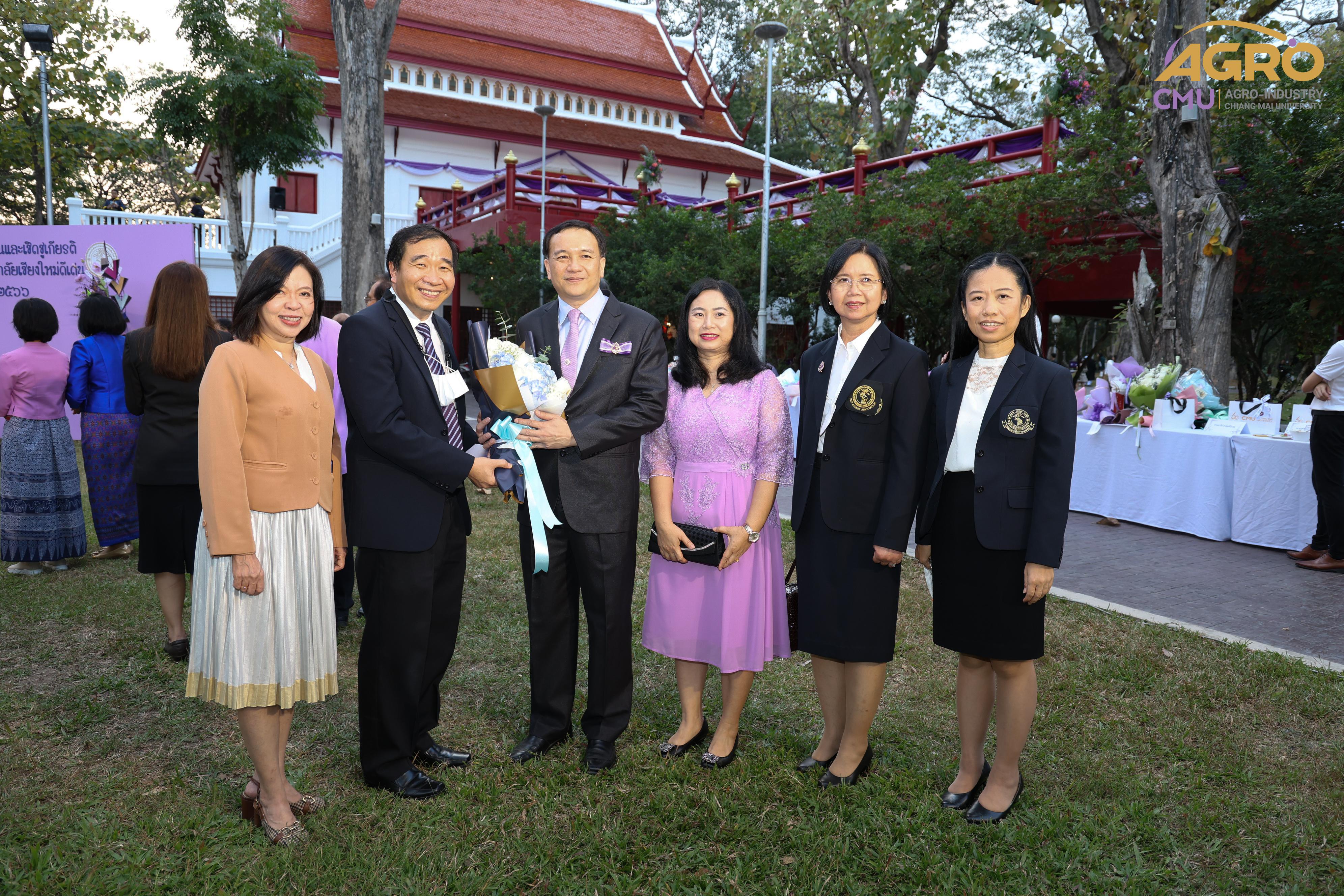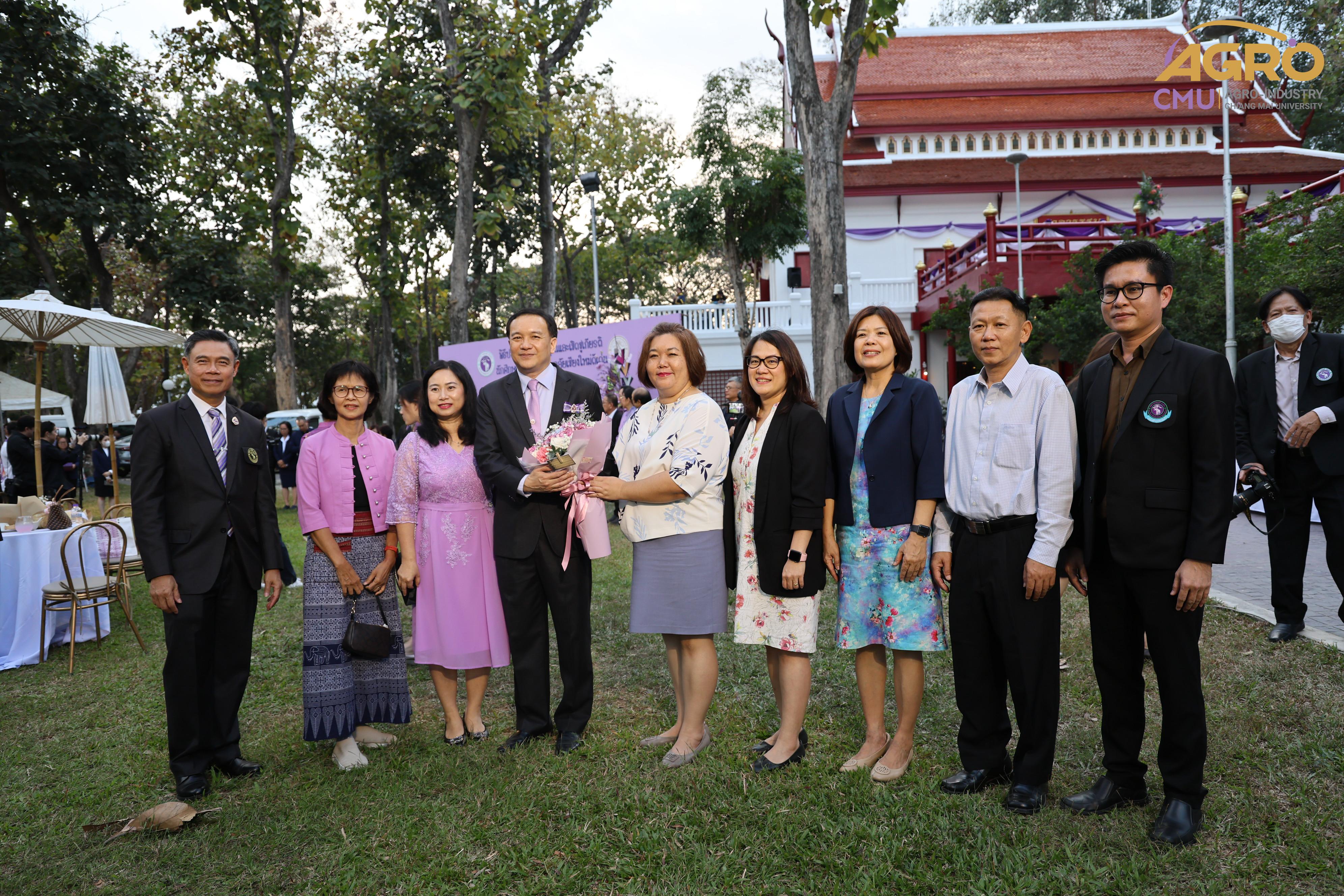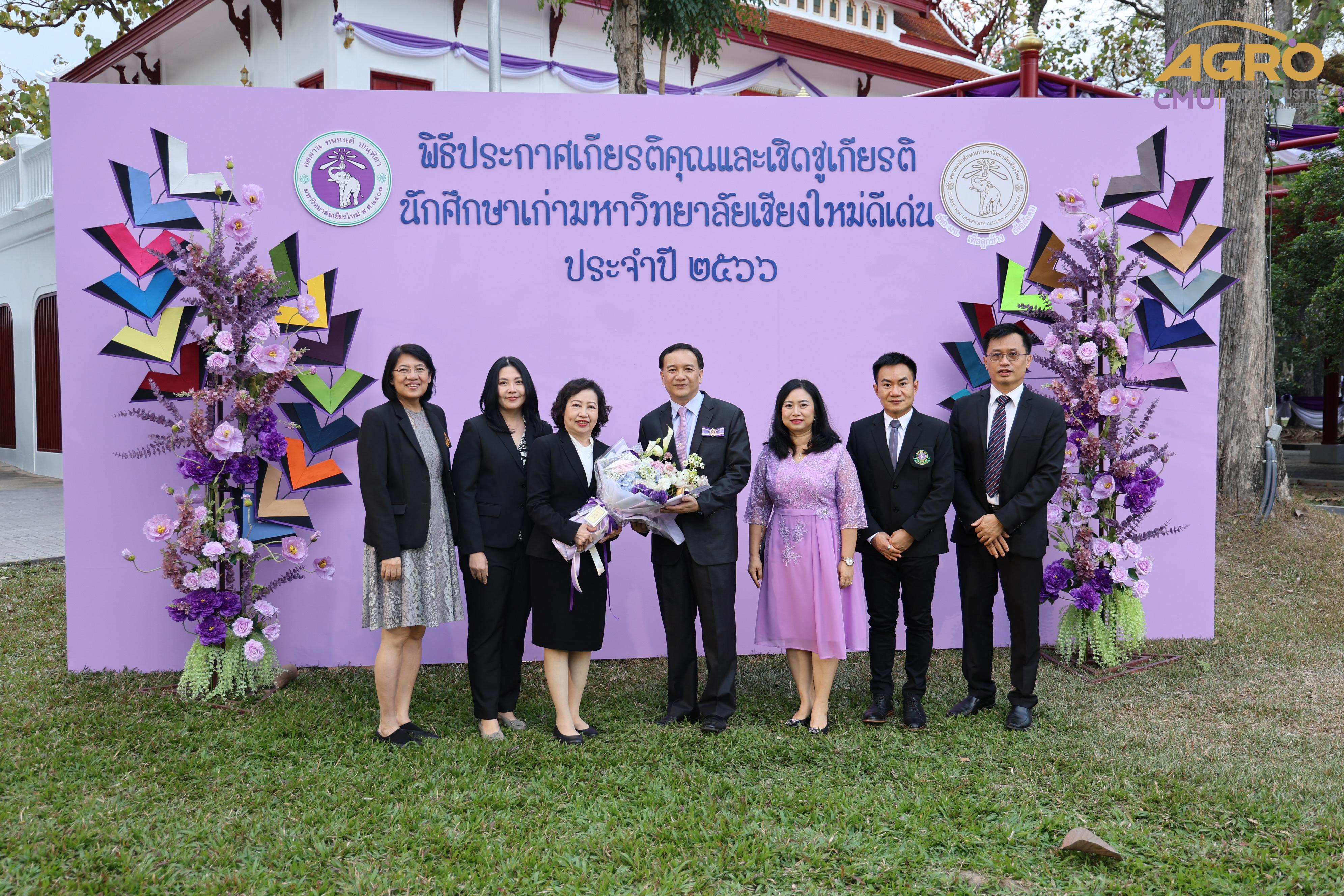 เมื่อวันอาทิตย์ที่ 28 มกราคม 2567 ผู้ช่วยศาสตราจารย์ ดร.สุจินดา ศรีวัฒนะ คณบดีคณะอุตสาหกรรมเกษตร พร้อมด้วยผู้บริหารและบุคลากรคณะอุตสาหกรรมเกษตร ร่วมมอบช่อดอกไม้ เพื่อแสดงความยินดีกับ ศาสตราจารย์ปฏิบัติ ดร.ชรินทร์ เตชะพันธุ์ รองอธิการบดีมหาวิทยาลัยเชียงใหม่ ในโอกาสที่ได้รับการประกาศเกียรติคุณให้เป็น นักศึกษาเก่ามหาวิทยาลัยเชียงใหม่ดีเด่น ประจำปี 2566 สาขาวิชาการ ณ ศาลาธรรม มหาวิทยาลัยเชียงใหม่