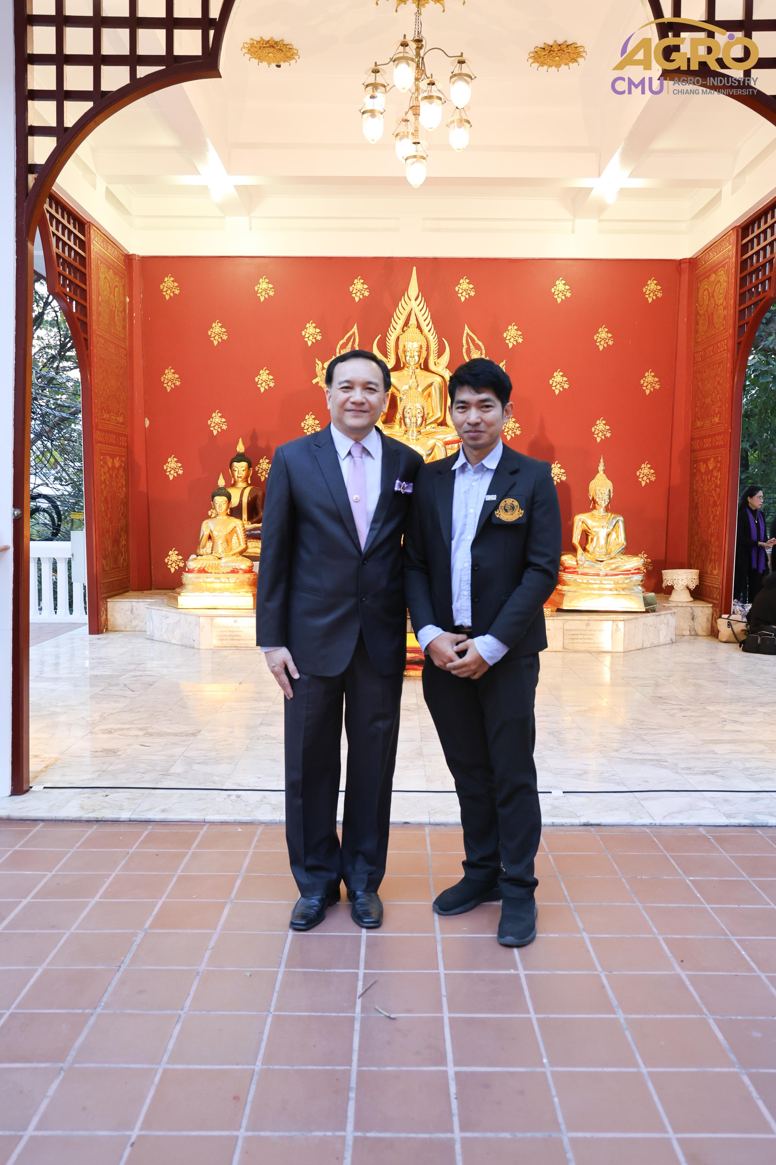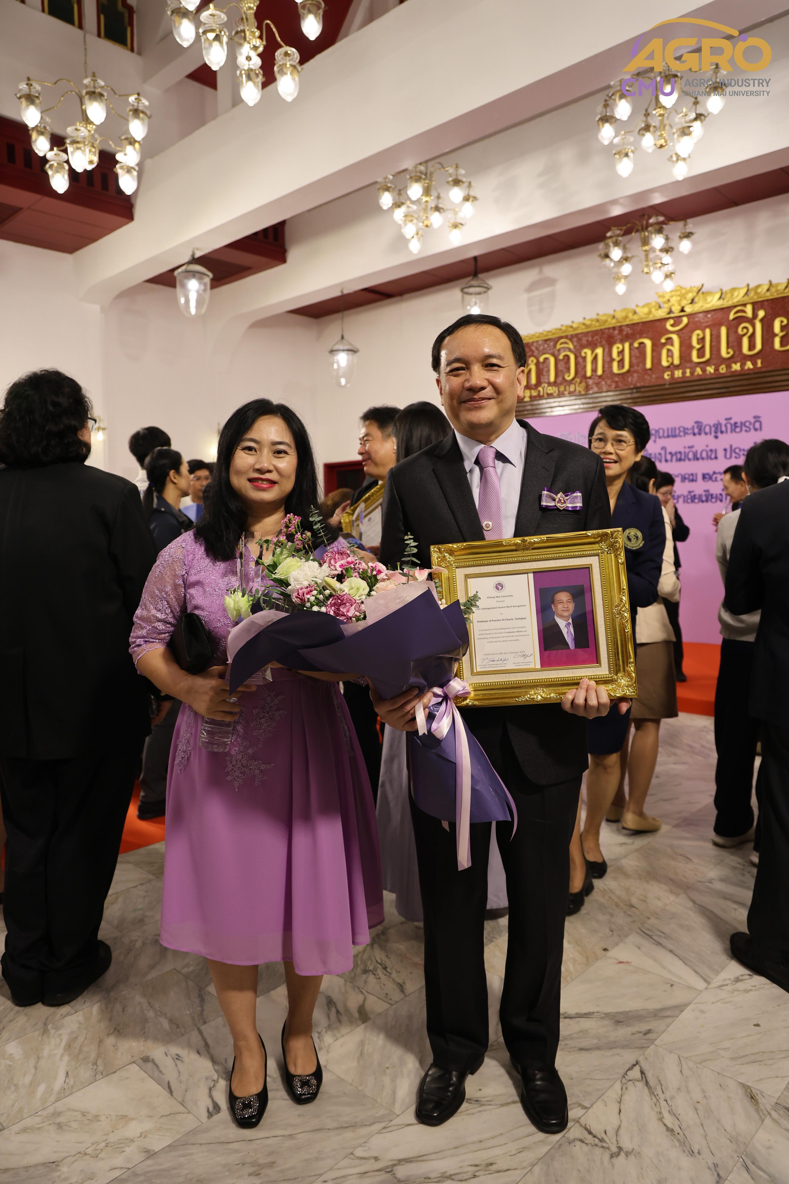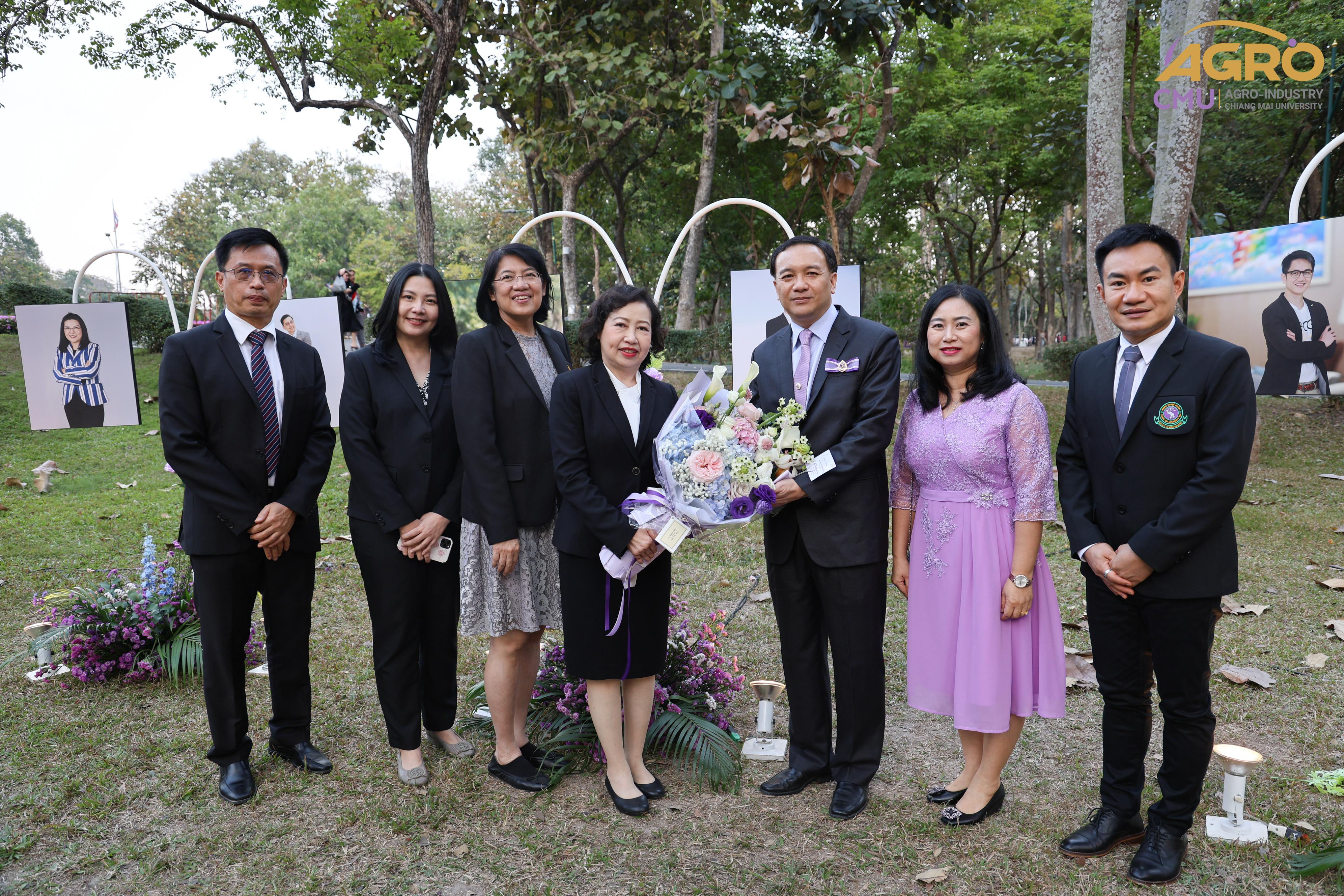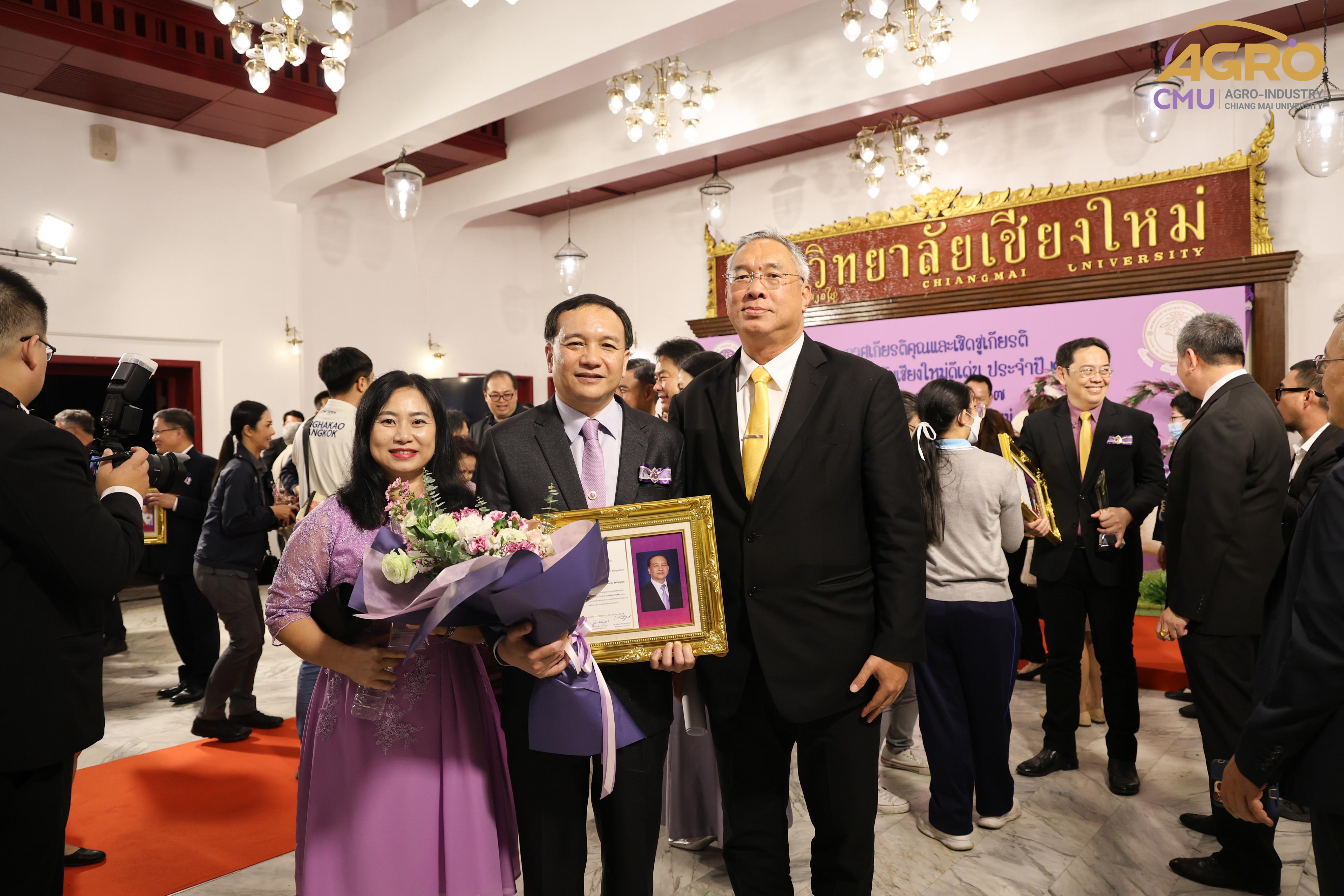 เมื่อวันอาทิตย์ที่ 28 มกราคม 2567 ผู้ช่วยศาสตราจารย์ ดร.สุจินดา ศรีวัฒนะ คณบดีคณะอุตสาหกรรมเกษตร พร้อมด้วยผู้บริหารและบุคลากรคณะอุตสาหกรรมเกษตร ร่วมมอบช่อดอกไม้ เพื่อแสดงความยินดีกับ ศาสตราจารย์ปฏิบัติ ดร.ชรินทร์ เตชะพันธุ์ รองอธิการบดีมหาวิทยาลัยเชียงใหม่ ในโอกาสที่ได้รับการประกาศเกียรติคุณให้เป็น นักศึกษาเก่ามหาวิทยาลัยเชียงใหม่ดีเด่น ประจำปี 2566 สาขาวิชาการ ณ ศาลาธรรม มหาวิทยาลัยเชียงใหม่