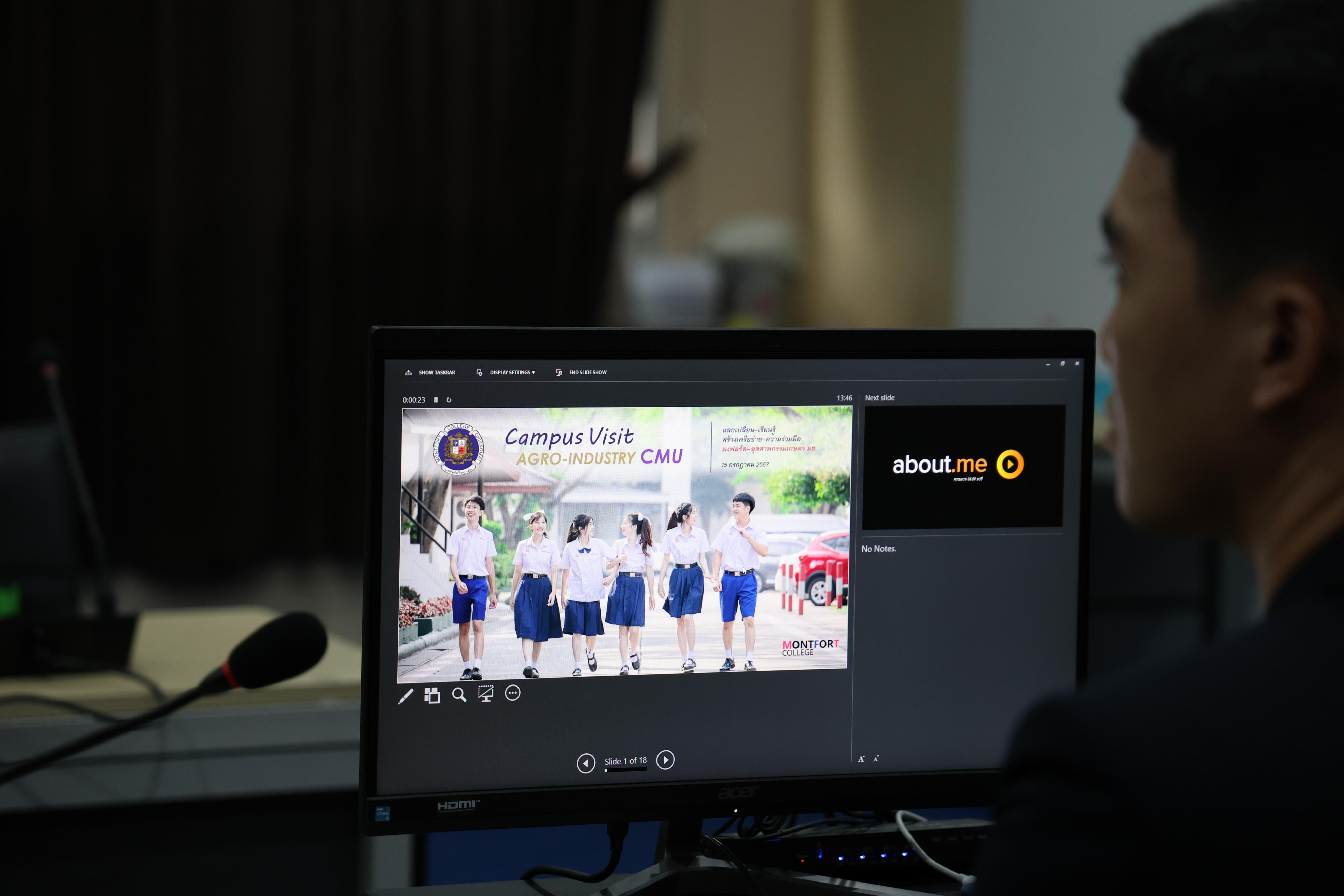 เมื่อวันจันทร์ที่ 15 กรกฎาคม 2567 รองศาสตราจารย์ ดร.ยุทธนา พิมลศิริผล คณบดีคณะอุตสาหกรรมเกษตร พร้อมด้วยคณะผู้บริหารและบุคลากรคณะอุตสาหกรรมเกษตร ร่วมให้การต้อนรับคณะผู้บริหารและคณาจารย์จากโรงเรียนมงฟอร์ตวิทยาลัย ในโอกาสเข้าพบผู้บริหารคณะอุตสาหกรรมเกษตร เพื่อหารือเกี่ยวกับความร่วมมือทางวิชาการ พร้อมกันนี้ได้รับฟังการนำเสนอโครงการของโรงเรียน เกี่ยวกับการจัดการเรียนการสอนหลักสูตร Bilingual Programme และ English Programme รวมถึงมีการจัดกิจกรรมทางวิชาการ และกิจกรรมพัฒนาผู้เรียนอย่างหลากหลาย โดยมีวัตถุประสงค์เพื่อส่งเสริมพัฒนาศักยภาพของนักเรียนทุกมิติ อีกทั้งยังเป็นการสร้างเครือข่ายความร่วมมือเพื่อร่วมกันพัฒนานักเรียน ณ ห้องประชุม 3 อาคารสำนักงานคณะอุตสาหกรรมเกษตร หลังจากนั้น ได้เยี่ยมชมศูนย์นวัตกรรมอาหารและบรรจุภัณฑ์ (FIN) คณะอุตสาหกรรมเกษตร