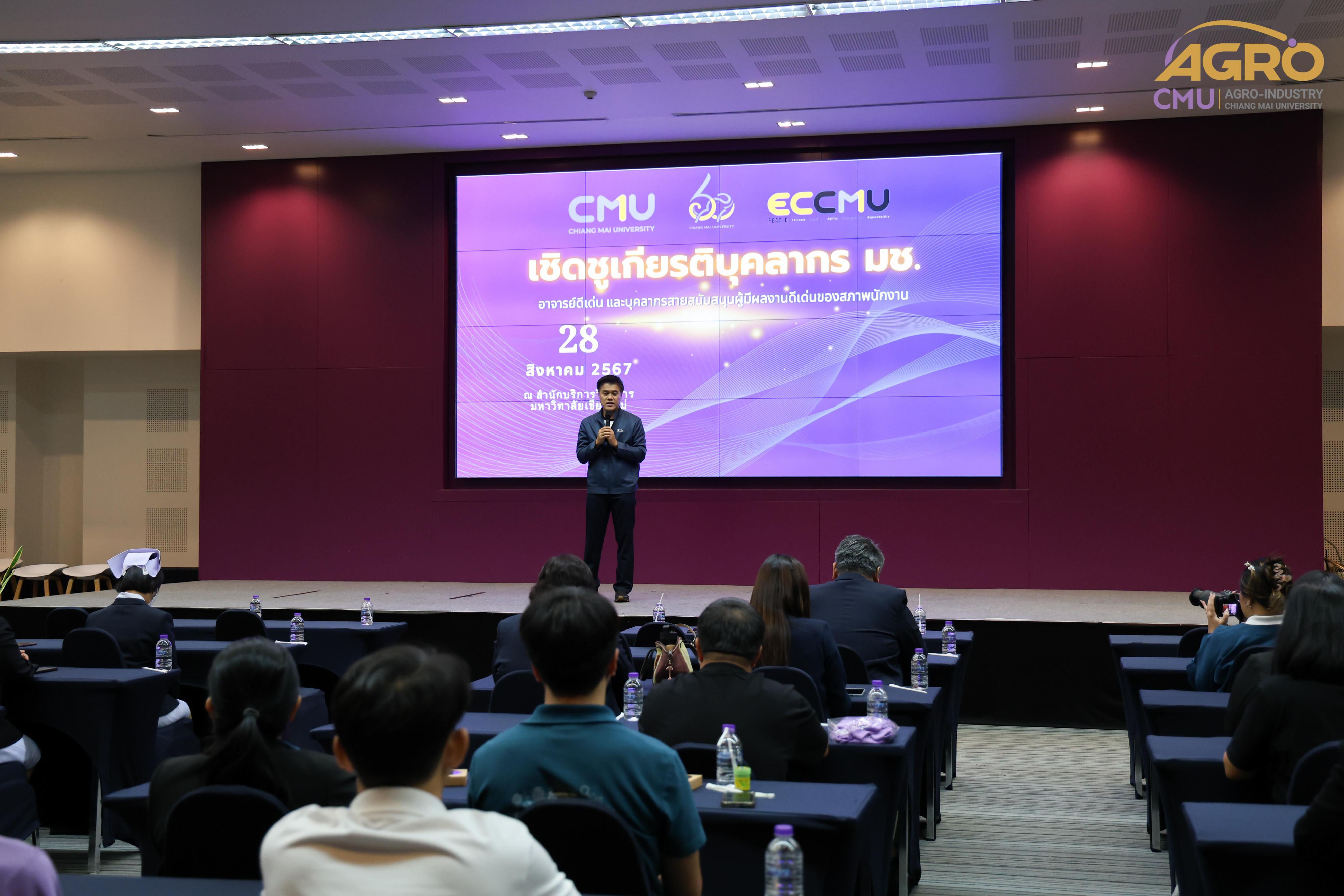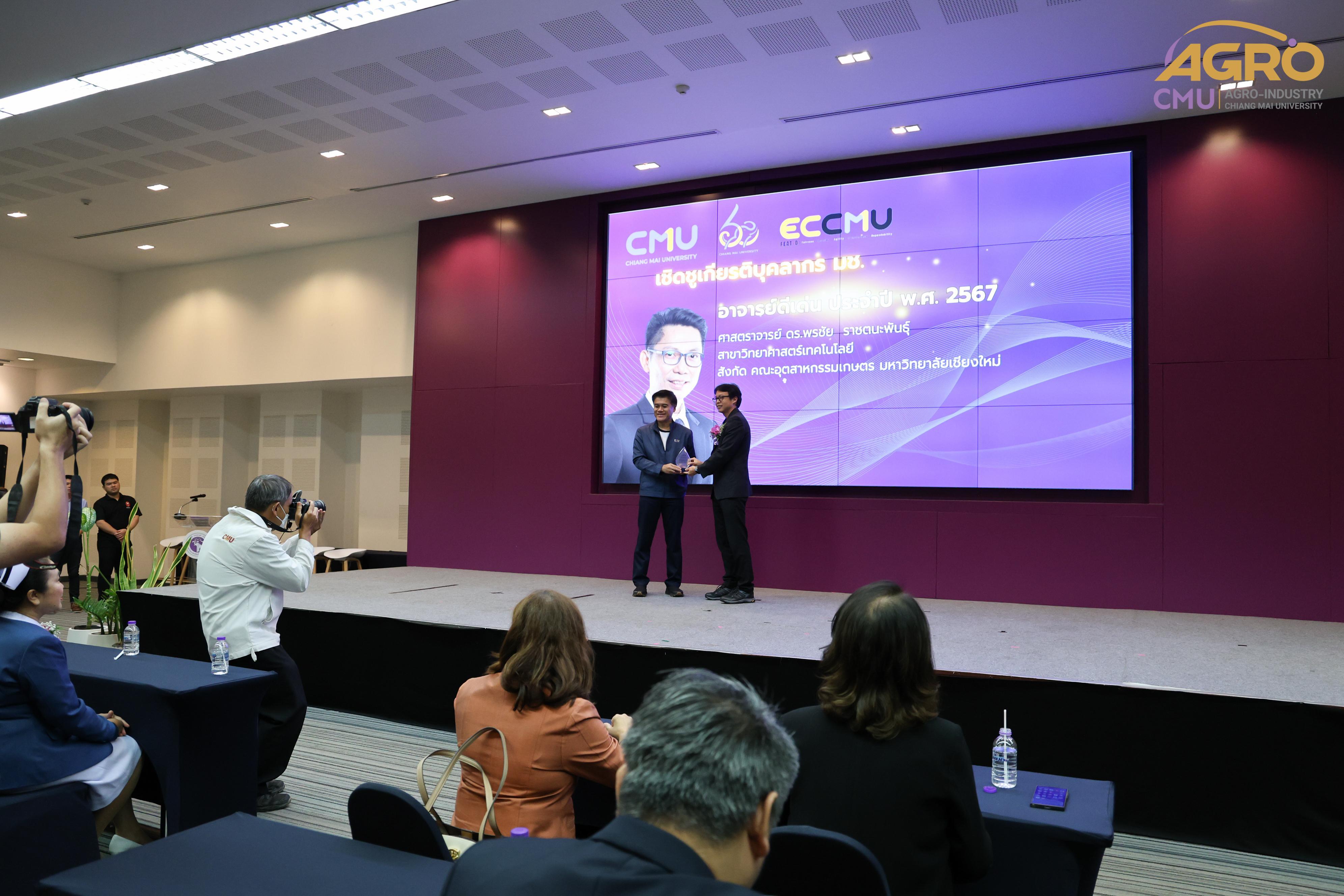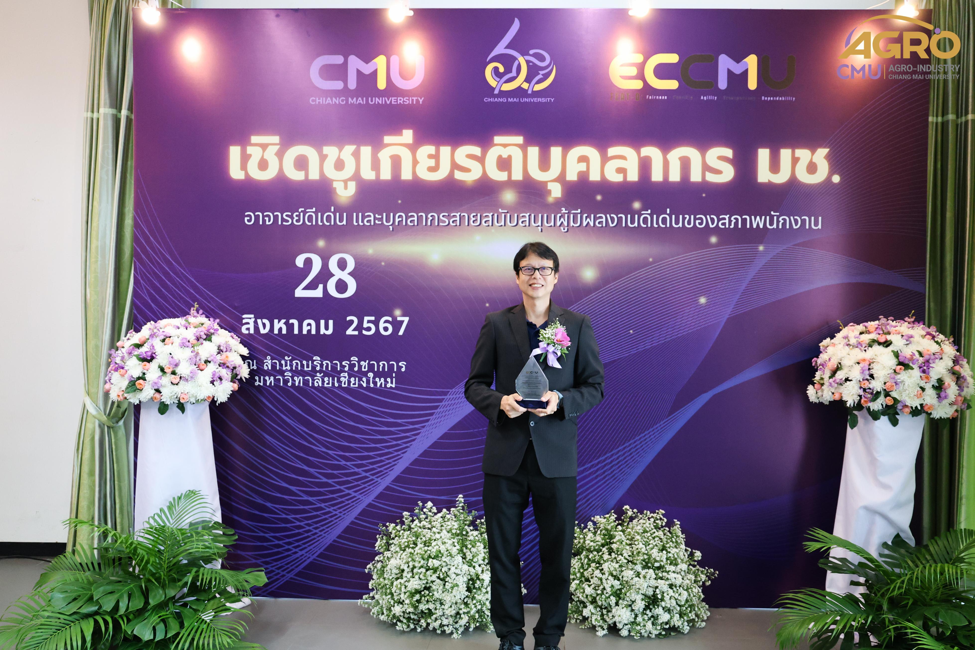 เมื่อวันที่ 28 สิงหาคม 2567 รองศาสตราจารย์ ดร.กิตติศักดิ์ จันทนสกุลวงศ์ ผู้ช่วยคณบดี ผู้แทนคณบดีเข้าร่วมในพิธีมอบโล่รางวัล เชิดชูเกียรติบุคลากร มหาวิทยาลัยเชียงใหม่ อาจารย์ดีเด่น และบุคลากรสายสนับสนุนผู้มีผลงานดีเด่นของสภาพนักงาน พร้อมกันนี้ได้เป็นผู้แทนรับรางวัล โดยคณะอุตสาหกรรมเกษตร มีบุคลากรได้รับคัดเลือกให้เป็นผู้ได้รับรางวัล “อาจารย์ดีเด่นของสภาพนักงานมหาวิทยาลัยเชียงใหม่ ประจำปี พ.ศ.2567” คือ ศาสตราจารย์ ดร.พรชัย ราชตนะพันธุ์ สาขาวิทยาศาสตร์และเทคโนโลยี ณ ห้องประชุมทองกวาว 1 สำนักบริการวิชาการ มหาวิทยาลัยเชียงใหม่