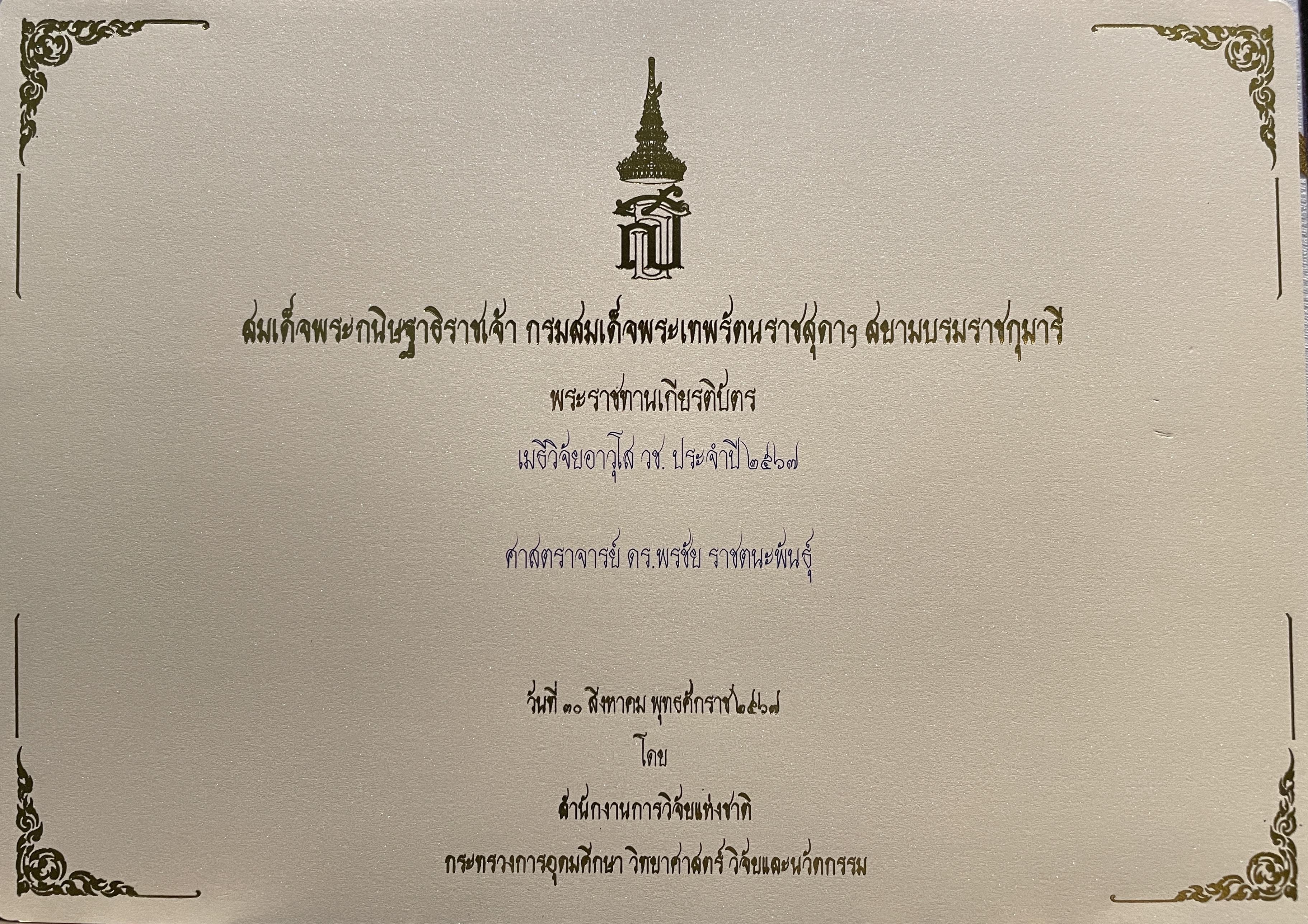ในการนี้สมเด็จพระกนิษฐาธิราชเจ้า กรมสมเด็จพระเทพรัตนราชสุดาฯ สยามบรมราชกุมารี ทรงพระกรุณาโปรดเกล้าฯ พระราชทานเกียรติบัตร และโล่พระราชทานเมธีวิจัยอาวุโส ประจำปี 2567 ให้กับนักวิจัยที่ได้รับรางวัลซึ่งจัดโดยสำนักงานการวิจัยแห่งชาติ กระทรวงการอุดมศึกษา วิทยาศาสตร์ วิจัยและนวัตกรรม เมื่อวันที่ 30 สิงหาคม 2567 ณ โรงแรมเซ็นทาราแกรนด์ และบางกอกคอนเวนชันเซ็นเตอร์ เซ็นทรัลเวิลด์ กรุงเทพฯ