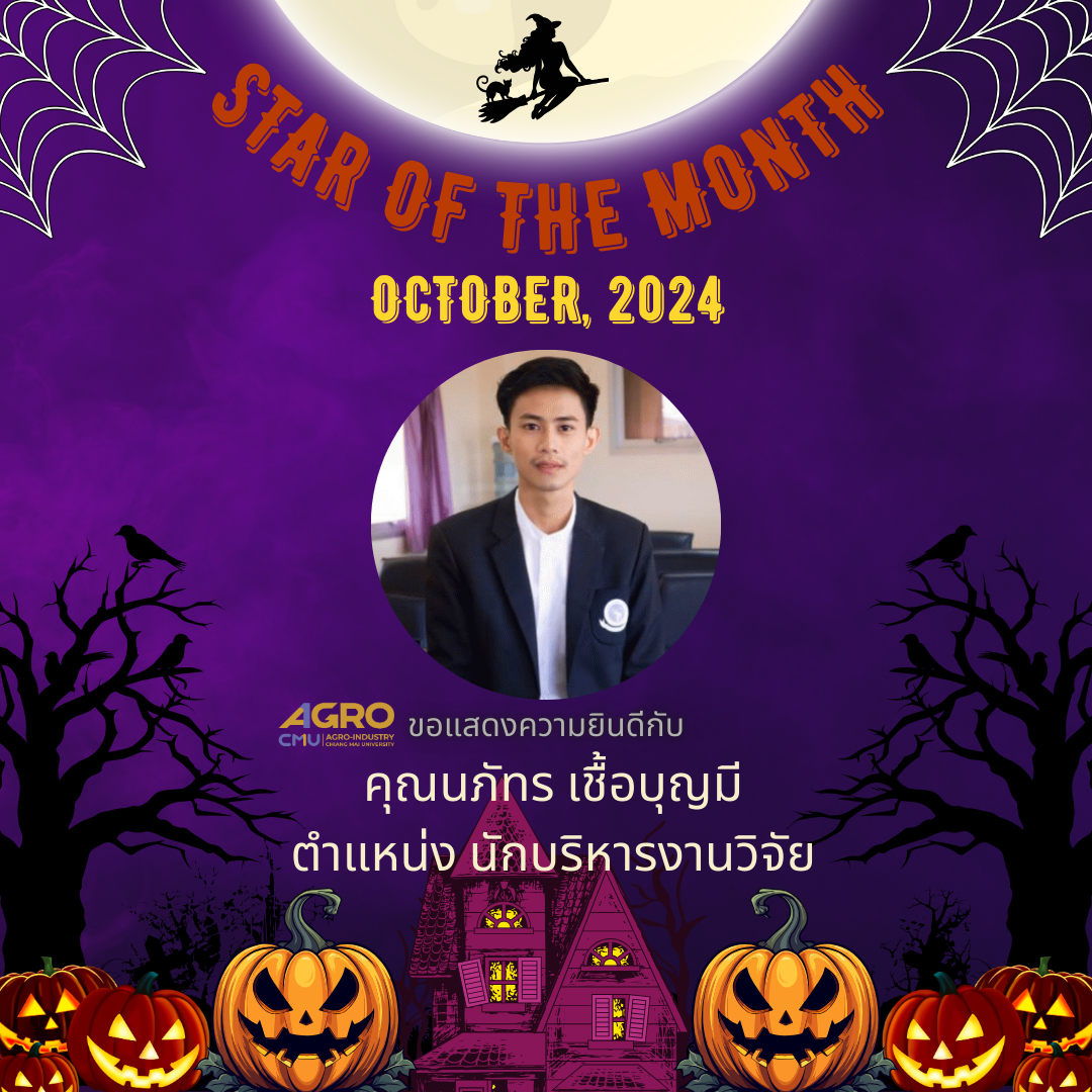 Faculty of Agro-Industry, Chiang Mai University would like to congratulate Mrs. Nalintida Chaimongkol, Human Resource Officer, and Mr. Naphat Chueaboonmee, Research Executive Officer, who were voted STAR OF THE MONTH for October 2024. The STAR OF THE MONTH activity was created to encourage workers with outstanding performance. The voting results come from executives and employees of the organization.