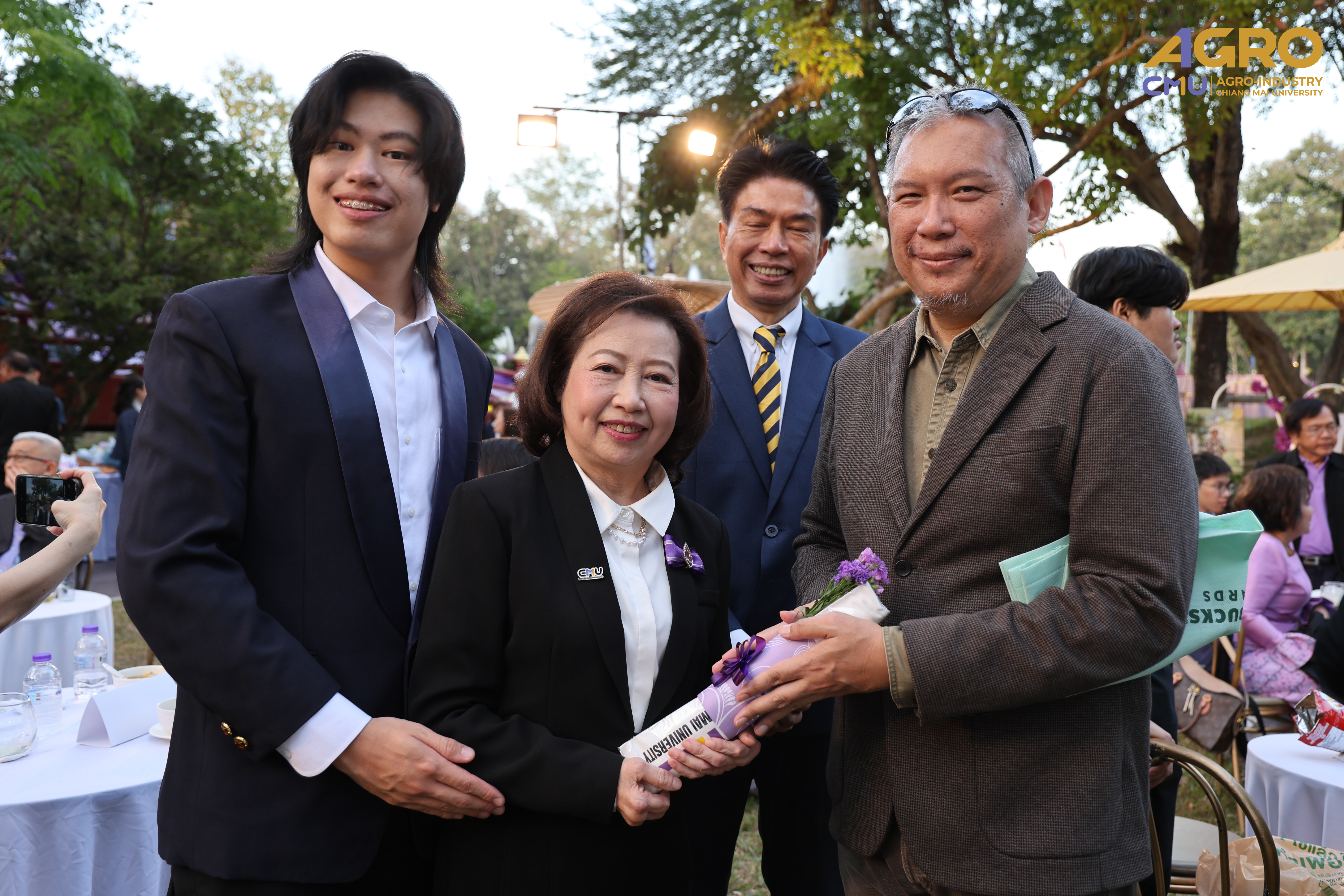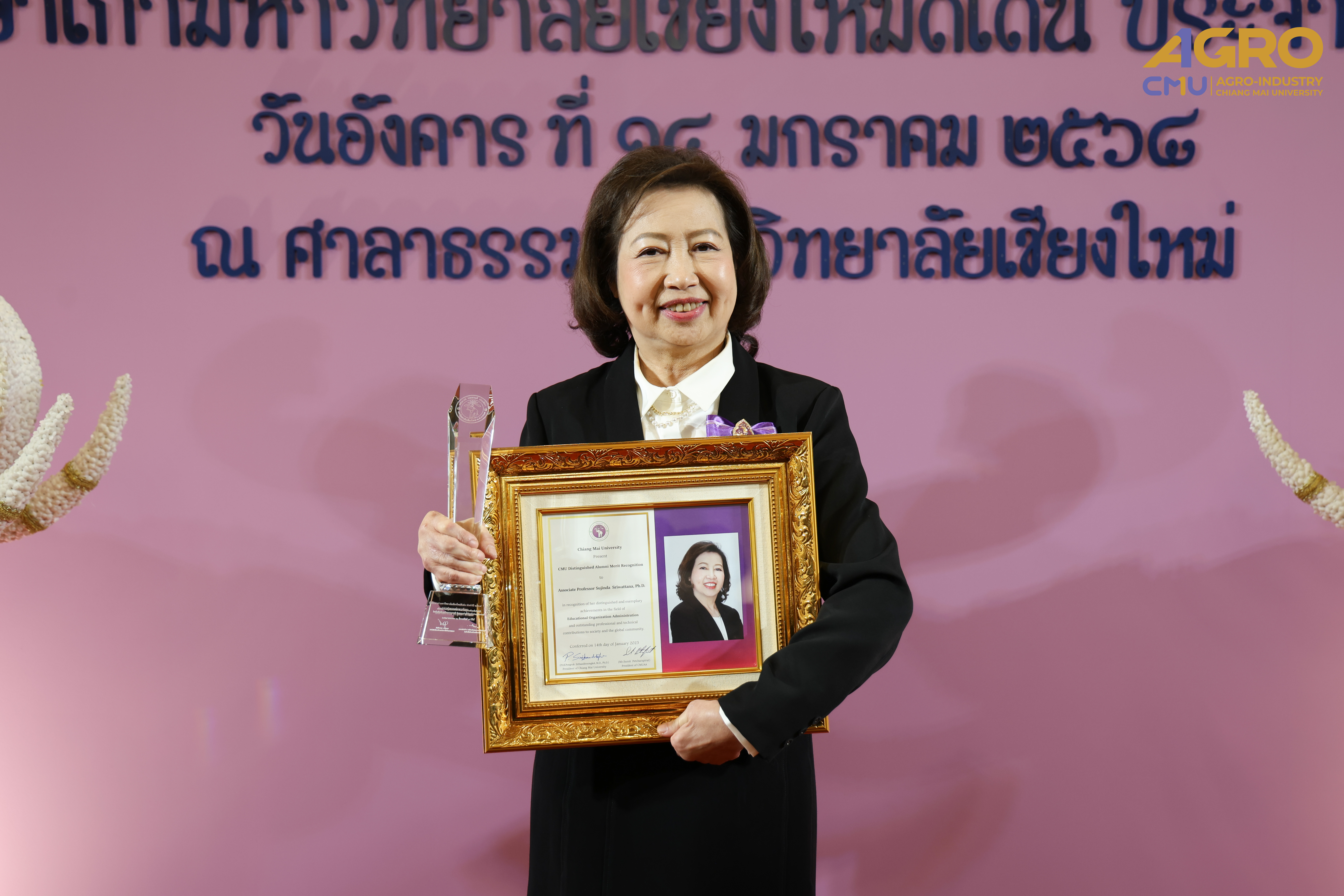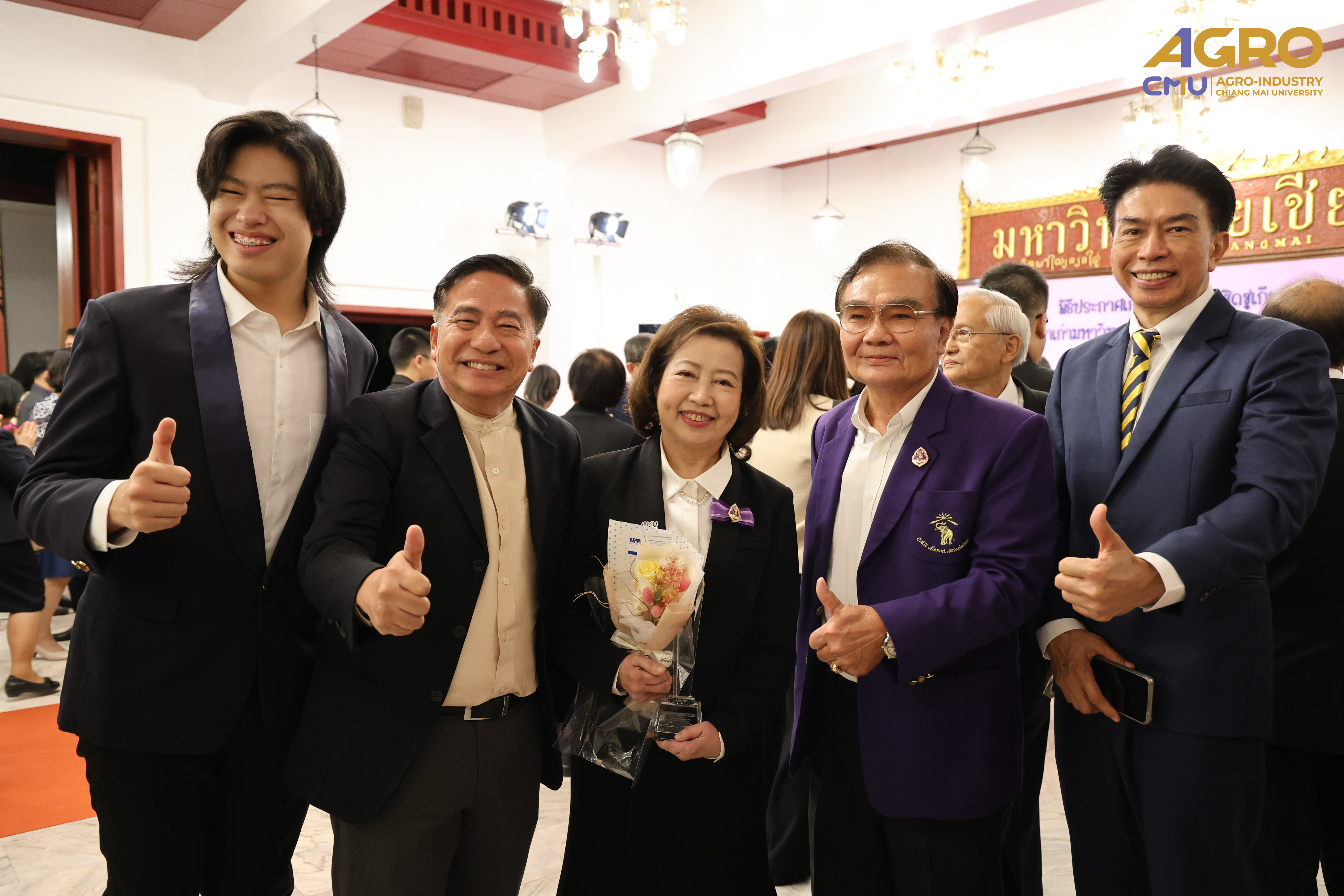 On January 14, 2025, Associate Professor Dr.Yuthana Phimolsiripol, Dean of the Faculty of Agro-Industry, along with the faculty executives and staffs gave the bouquet of flower to extended its heartfelt congratulations to Associate Professor Dr.Sujinda Sriwattana (Student ID 2508167) who have received Outstanding Alumni Award from CMU Alumni Association at Dhamma pavilion of Chiang Mai University. On the special occasion of being selected as Outstanding alumni of Chiang Mai University Educational Organization Administration Branch, the Year 2024.