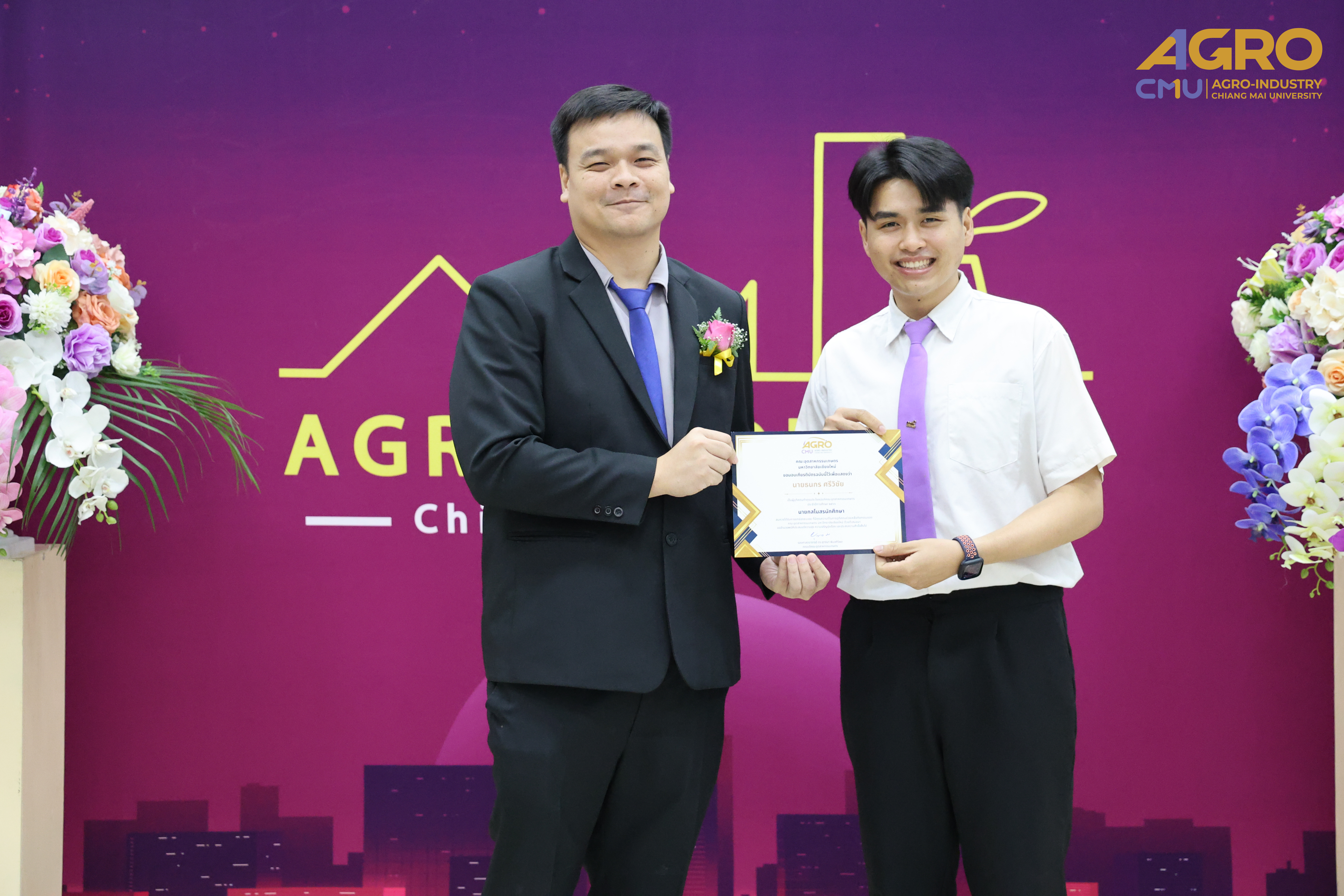 The Faculty of Agro-Industry recognizes the importance of students who contribute to the faculty and aims to encourage and support them in various aspects, including academics, faculty and community service, and well-rounded abilities. As part of this initiative, a certificate of recognition was awarded to students who have brought prestige to the faculty and dedicated themselves to its betterment. This recognition was presented alongside the scholarship awards, which were categorized into four types: Financial Need-Based, Academic Excellence, Agro DNA, and Faculty & Community Service.