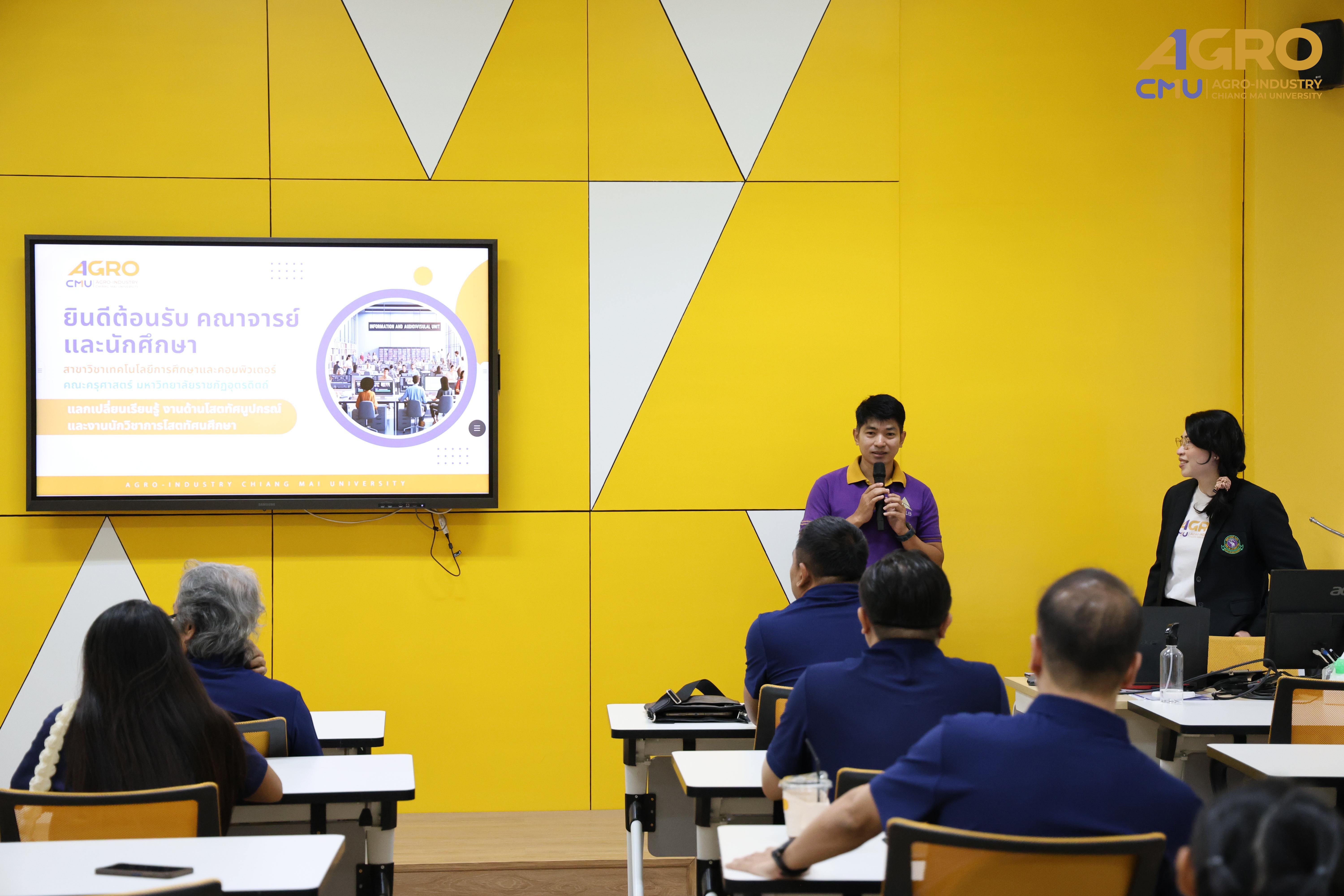 เมื่อวันที่ 9 เมษายน 2568 ผู้ช่วยศาสตราจารย์ ดร.จุไรรัตน์ เม้ากำเนิด ผู้ช่วยคณบดี คณะอุตสาหกรรมเกษตร มหาวิทยาลัยเชียงใหม่ เป็นประธานกล่าวยินดีต้อนรับ อาจารย์ ดร.เชาวฤทธิ์ จั่นจีน คณบดี คณะครุศาสตร์ มหาวิทยาลัยราชภัฏอุตรดิตถ์ พร้อมด้วยคณาจารย์ และนักศึกษาสาขาวิชาเทคโนโลยีการศึกษาและคอมพิวเตอร์ ในโอกาสที่ได้เข้ามาแลกเปลี่ยนเรียนรู้งานด้านเทคโนโลยีการศึกษา และภาระงานที่เกี่ยวข้องกับนักวิชาการโสตทัศนศึกษา โดยมี นายวรกร สุพร นักบริหารเทคโนโลยีการศึกษา เป็นผู้แลกเปลี่ยนเรียนรู้ ซึ่งนักศึกษาจะได้เรียนรู้และเห็นการทำงานจริงในสถานที่ทำงาน ช่วยให้เข้าใจและเห็นภาพรวมของงานด้านเทคโนโลยีการศึกษาและคอมพิวเตอร์ได้อย่างชัดเจน จำเป็นต่อการทำงานในอนาคต ไม่ว่าจะเป็นทักษะด้านเทคนิคหรือทักษะการทำงานร่วมกับผู้อื่น โดยจะเป็นประโยชน์ต่อการเลือกอาชีพและพัฒนาตนเองในอนาคต