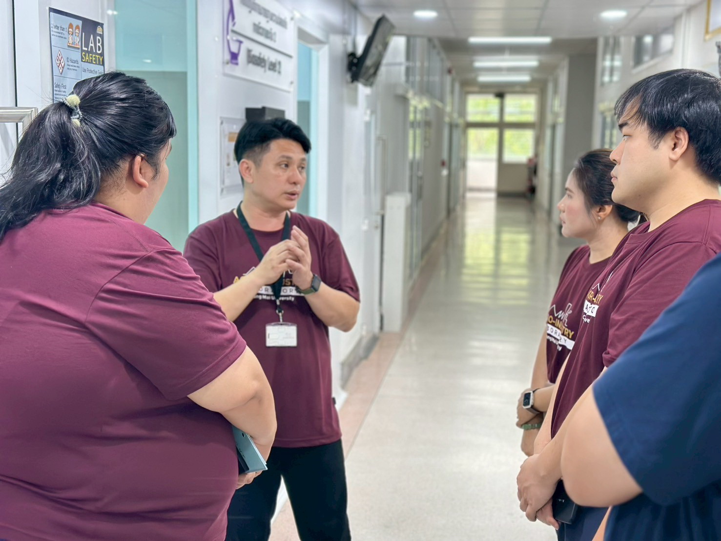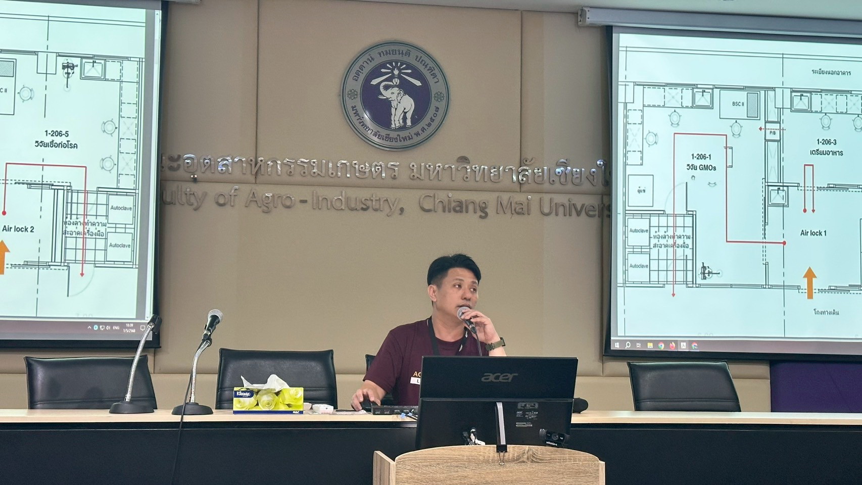 On Thursday, May 1, 2025, from 08:30 to 16:30, the Scientific Laboratory Division organized a knowledge exchange activity between the Scientific Operations Divisions of the Faculty of Agro-Industry, Chiang Mai University (CMU) and Samut Sakhon. The objective was to share experiences and best practices in laboratory management and scientific instrumentation, enhance laboratory safety standards related to chemical substances using the ESPReL Checklist, and promote the implementation of safety protocols for laboratories dealing with pathogens and animal toxins under the Pathogens and Animal Toxins Act, as well as Biosafety Level 2 laboratories.