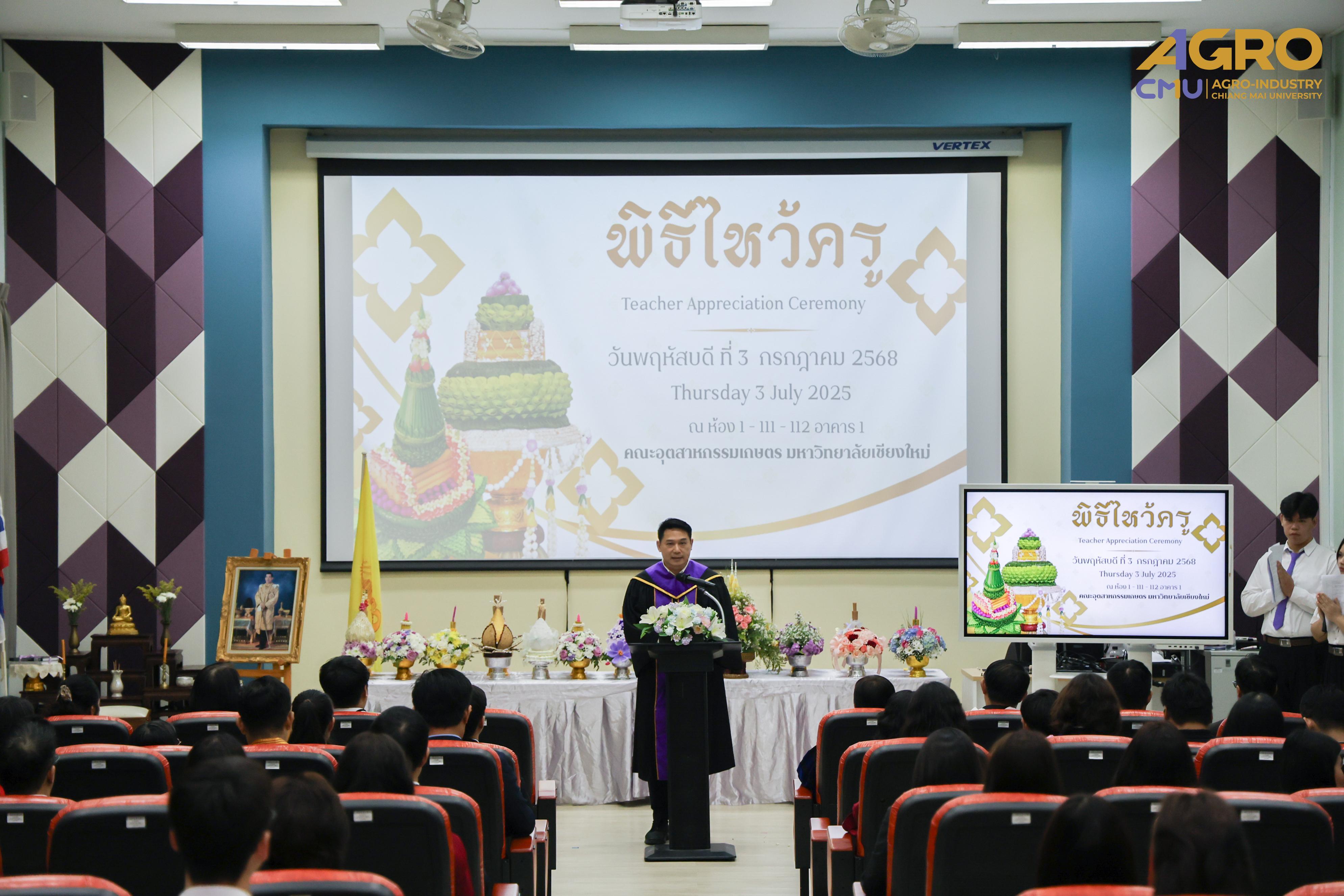 On July 3, 2025, the Student Council of the Faculty of Agro-Industry at Chiang Mai University successfully held its annual Wai Kru (Teacher Appreciation) Ceremony at Room 1-111-112, Building 1, Faculty of Agro-Industry. The ceremony was honored by the presence of Associate Professor Dr. Yuttana Pimolsiripon, Dean of the Faculty, who served as the ceremony's chairperson. Over 100 participants attended the event, including students, faculty members, and staff.