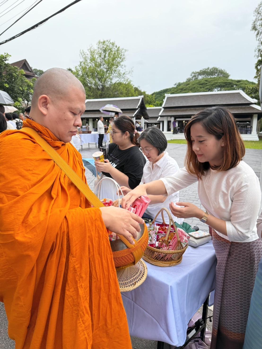 The day began with a morning alms-giving ceremony, presided over by Clinical Professor Emeritus Dr. Niwes Nantachit, former President of Chiang Mai University. The event took place at Khuang Wattanatham (Cultural Courtyard), Chiang Mai University, and was attended by Associate Professor Prasert Rerkkriengkrai, Vice President of the University, along with administrators, faculty members, staff, students, and members of the Buddhist community.