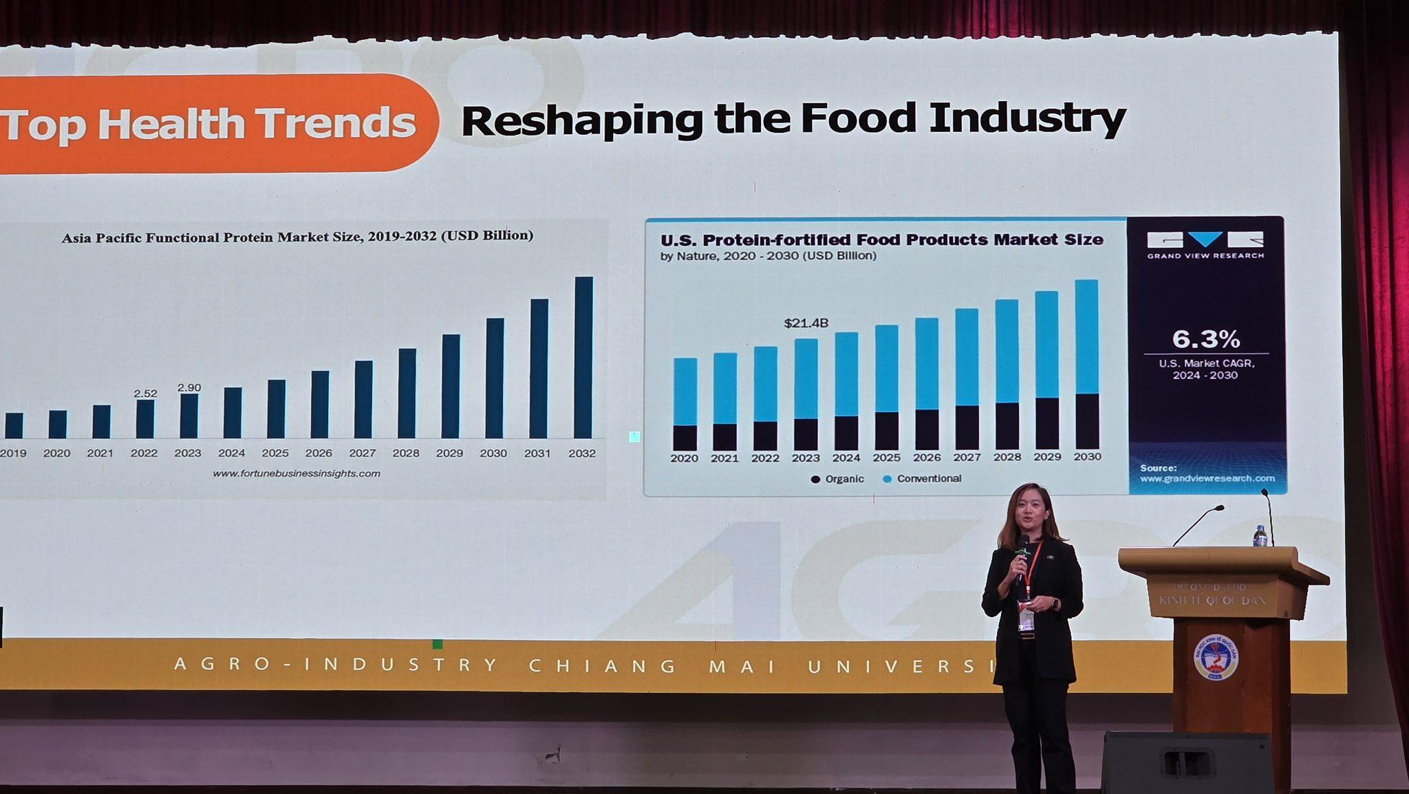 โดยได้นำเสนอแนวทางวิจัยและพัฒนาอาหารเพื่อสุขภาพที่ตอบสนองต่อความต้องการของผู้บริโภคยุคใหม่ ควบคู่ไปกับเป้าหมายการพัฒนาที่ยั่งยืนของโลก อีกทั้งนำเสนอเน้นงานวิจัยที่จัดทำขึ้นเพื่อสนับสนุนภาคเอกชน และสามารถนำไปใช้ประโยชน์ได้จริงในเชิงพาณิชย์ เนื้อหาในการบรรยายครอบคลุมทั้งกระบวนการพัฒนาสูตรอาหารจากพืชที่มีโปรตีนสูง ปราศจากกลูเตน ประโยชน์ทางโภชนาการ การยอมรับของผู้บริโภค ตลอดจนโอกาสทางการตลาดในระดับภูมิภาคและระดับโลก