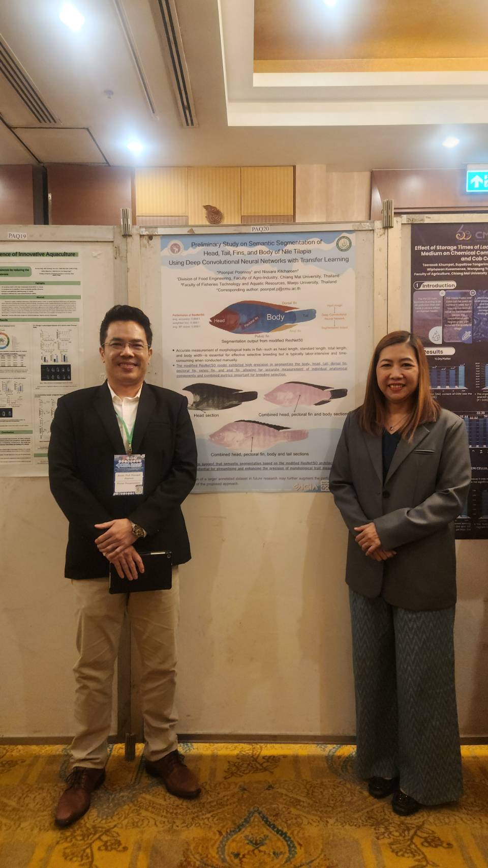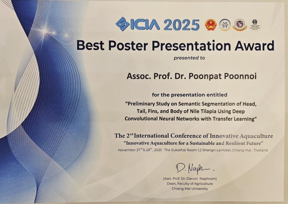The Faculty of Agro-Industry, Chiang Mai University, extends its heartfelt congratulations to Associate Professor Dr. Poonpat Poonnoy from the Faculty of Agro-Industry, Chiang Mai University, and Associate Professor Dr. Nissara Kitcharoen from the Faculty of Fisheries Technology and Aquatic Resources, Maejo University, on receiving the Best Poster Presentation Award at the 2nd International Conference of Innovative Aquaculture, “Innovative Aquaculture for a Sustainable and Resilient Future,” held on November 27–28, 2025, at Sukhothai Rooms 1 and 2, Shangri-La Hotel, Chiang Mai. The award was presented for their research titled “Preliminary Study on Semantic Segmentation of Head, Tail, Fins, and Body of Nile Tilapia Using Deep Convolutional Neural Networks with Transfer Learning.”