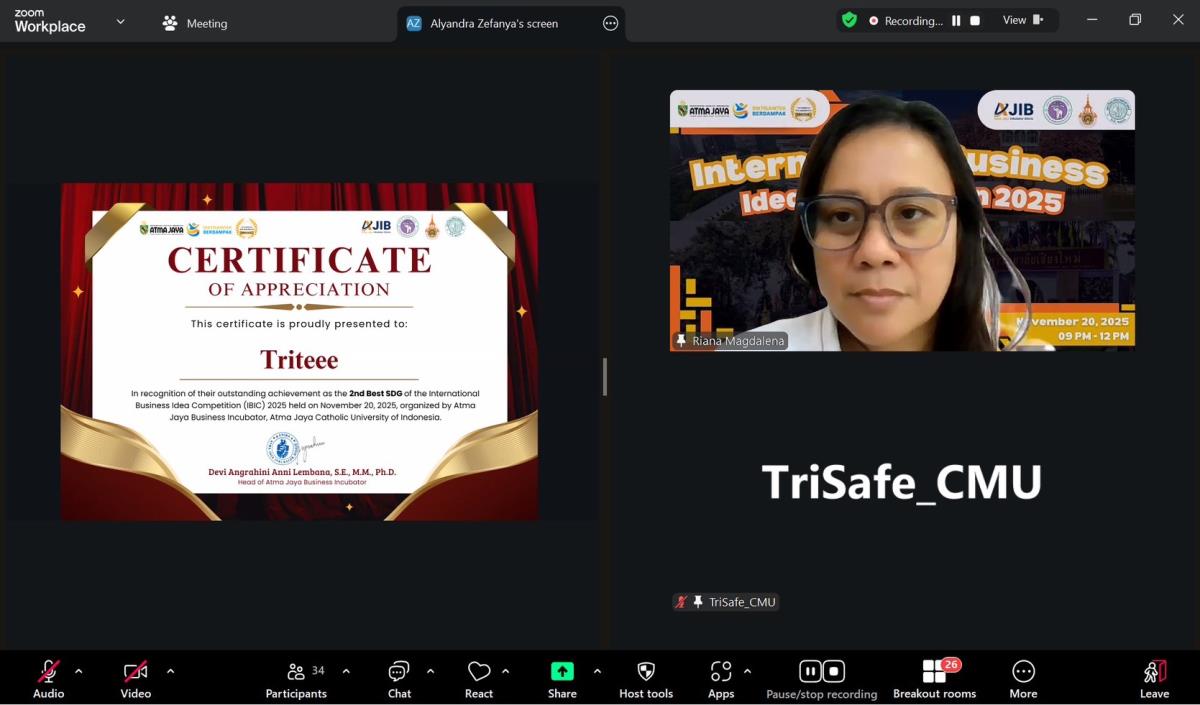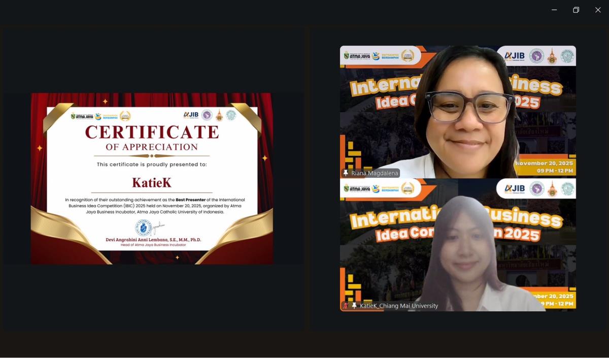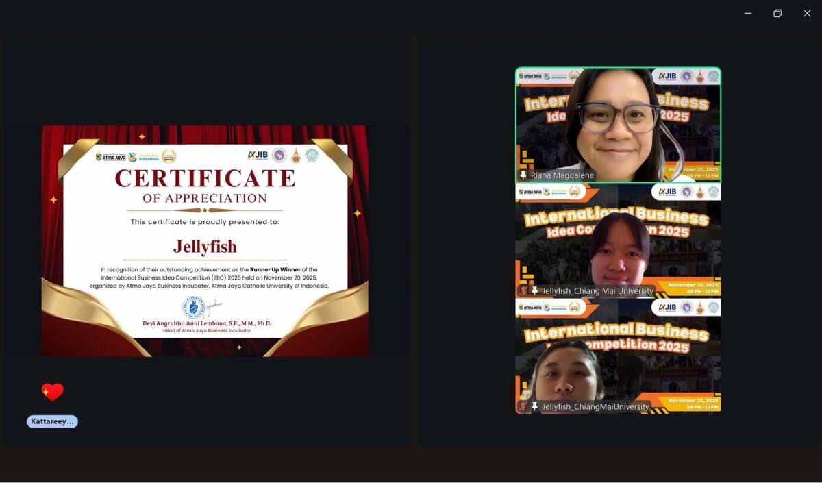 The Faculty of Agro-Industry, Chiang Mai University, proudly congratulates our students on winning three awards at the International Business Idea Competition 2025, organized by the Atma Jaya Business Incubator, Republic of Indonesia.