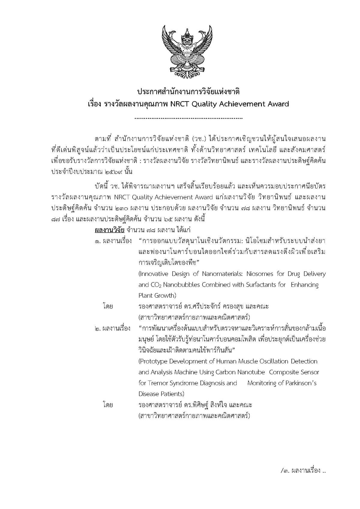 Congratulations to Dr. Euangploy Jailangka on Receiving the NRCT Quality Achievement Award